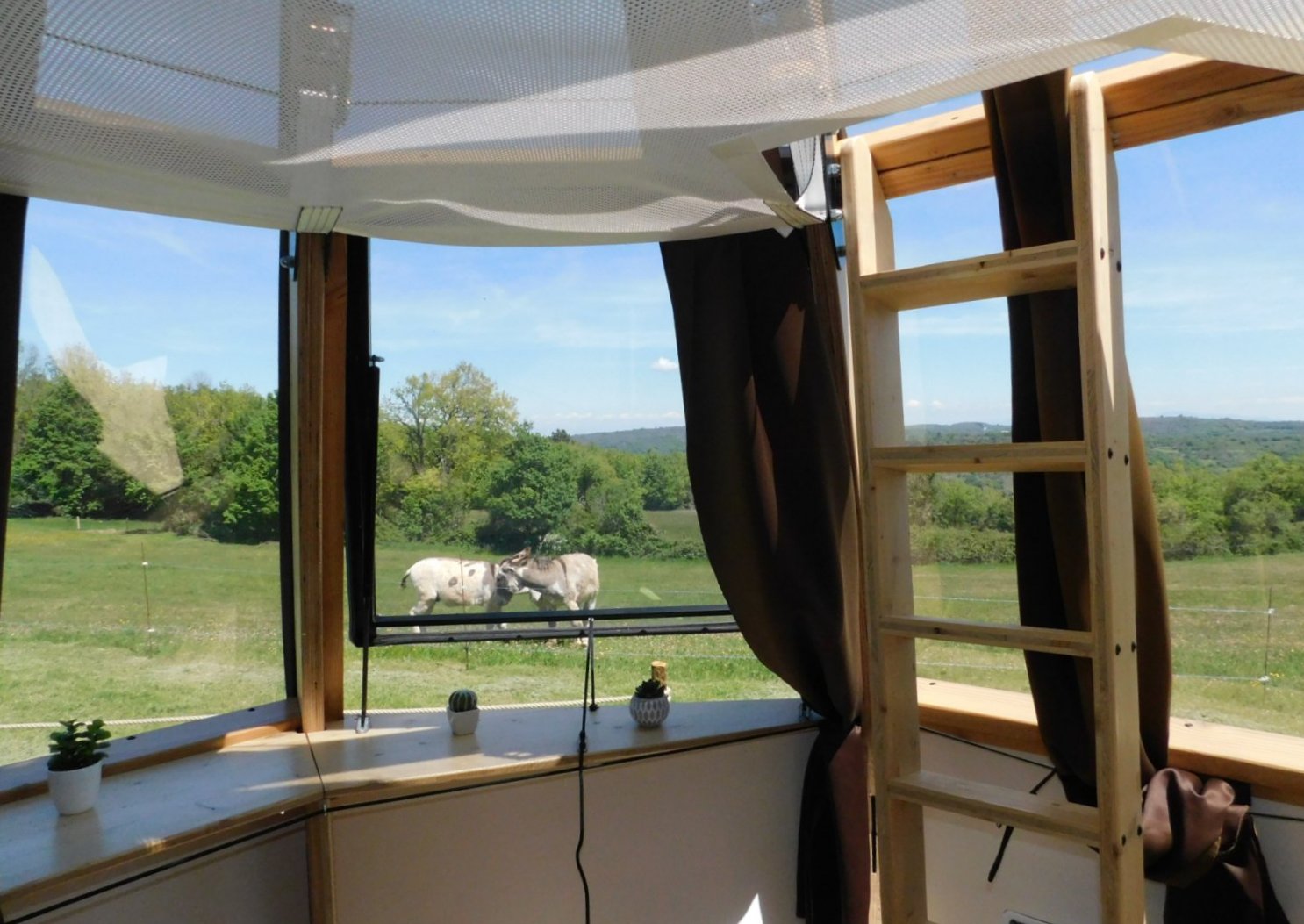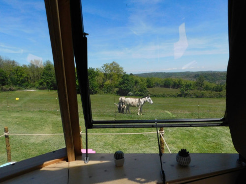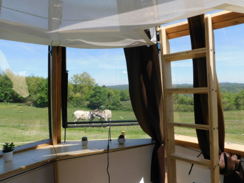 Cet hébergement détient une terrasse en bois attenante permettant de profiter du paysage qui s’offre à vous : un grand champ occupé par notre âne et on distingue au loin le mont Ventoux et une partie du parc naturel régional du Vercors, les plus chanceux auront la joie de voir renards, biches, chevreuils au seuil de leur goutte d’ô !