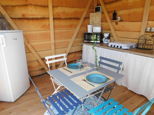 La cuisine est parfaitement équipée pour un logement insolite (micro-ondes multifonctions, réfrigérateur, cafetière "Dolce Gusto", plaques de cuisson et vaisselle de qualité). Les locataires peuvent prendre leur repas sur les différents espaces dédiés.