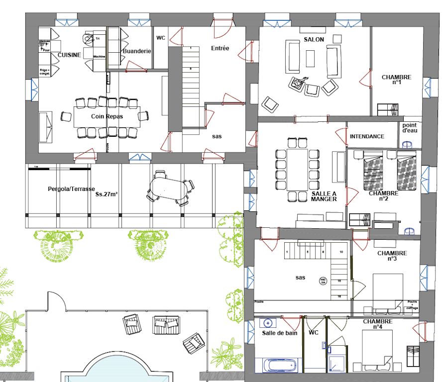 Grande cuisine avec espace repas, possibilité de cuisiner en famille, entrée, salon, salle à manger, salon de TV (avec canapé lit 140) desservant les chambres 3 et 4 et la salle de bains,1 chambre (lit 140) avec douche, 2 chambres (2 lits jumeaux 80x200 ou lit 2 pers. 160), 1 chambre (lit 160) avec douche, salle de bains, 2 WC indépendants, buanderie. Chauffage pompe à chaleur + convecteurs, climatisation. WiFi.
