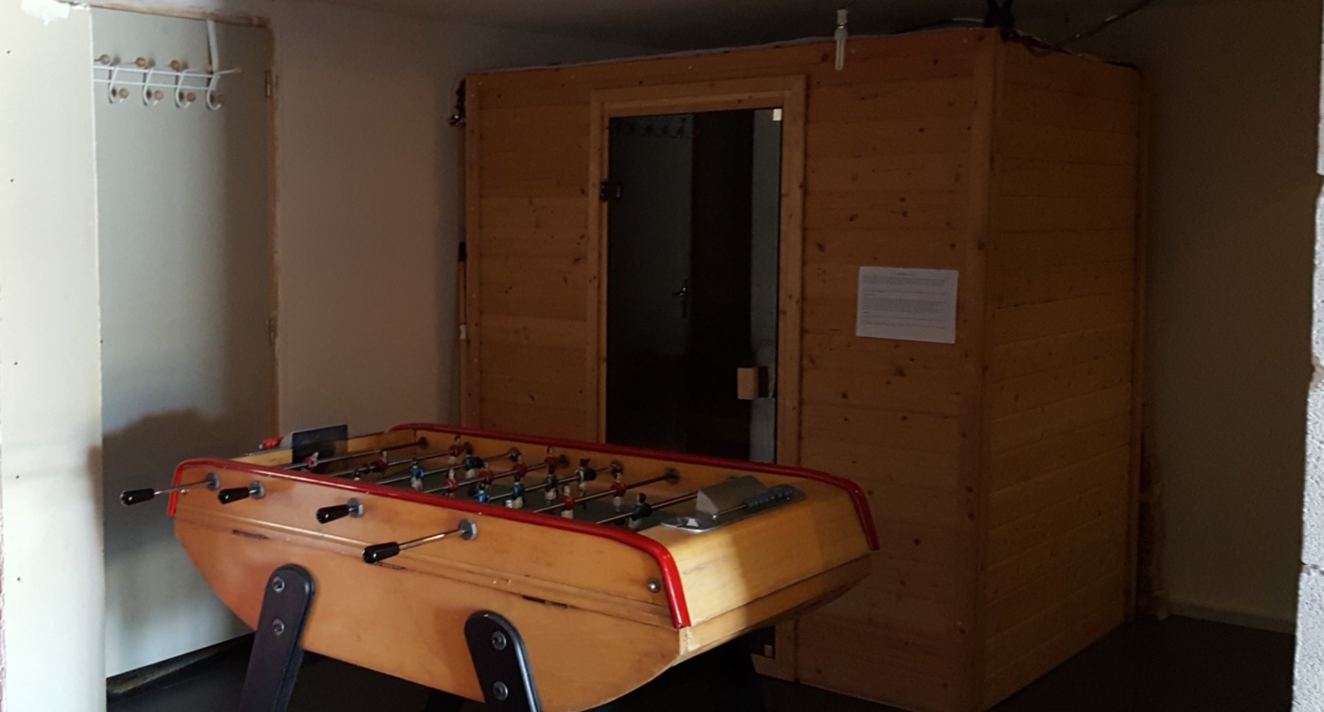 On y trouve la 4e chambre (3 lits en 90), un coin salon avec TV, une zone avec le sauna, le banc de musculation et le vélo d'appartement, une petite salle d'eau avec douche et WC, une table de tennis de table, un baby-foot et un flipper.