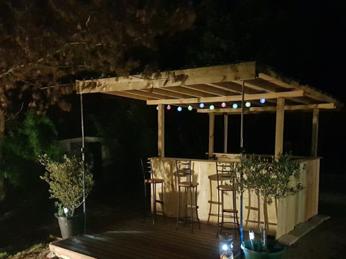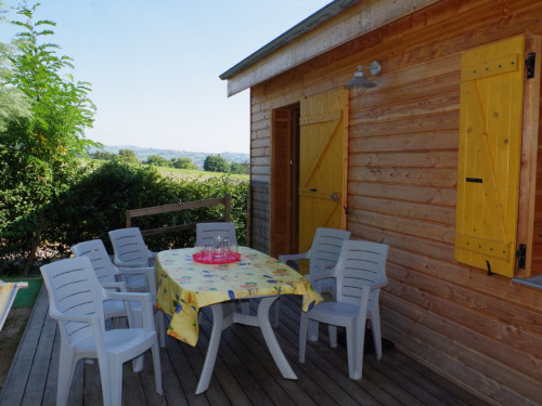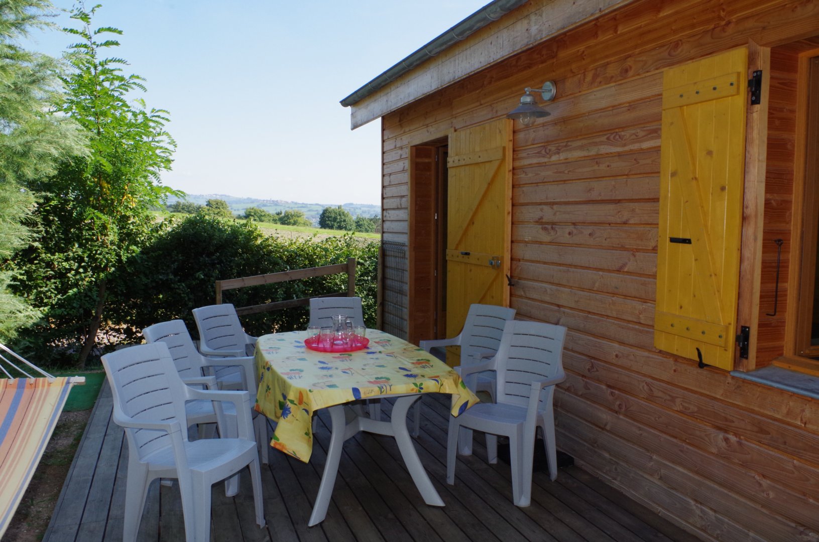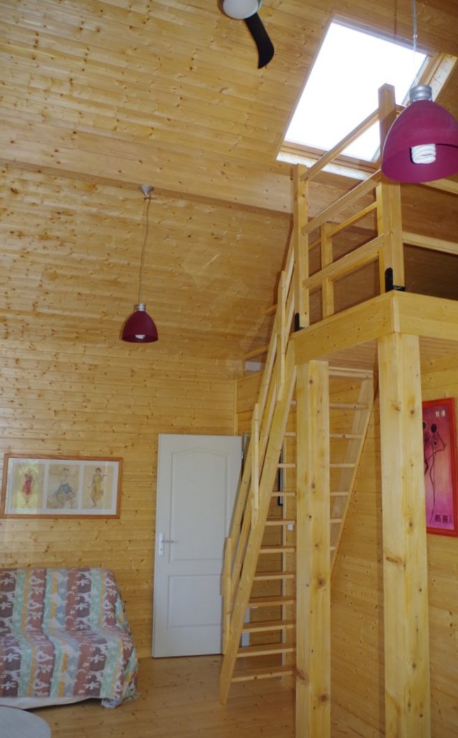 Il est tout en bois avec une belle terrasse et son salon de jardin.