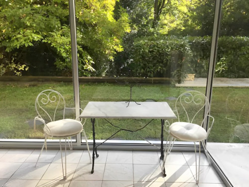 Belle pièce de vie de 34 m² sans compter le jardin d'hiver de 12 m² qui donne lui-même sur une terrasse enherbée à accès exclusif, sur un beau jardin arboré, cuisine équipée, grande chambre vue jardin sans vis-à-vis, dressing, SDB, WC séparé