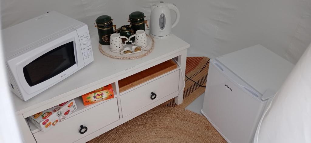 Cette tente de luxe comprend une télévision à écran plat.