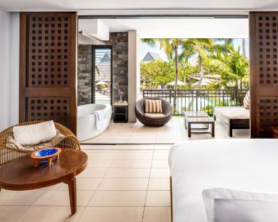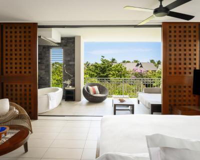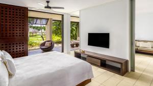 All spacious rooms at InterContinental Fiji Golf Resort & Spa feature a 55-inch-inch-flat-screen smart TV, a minibar, sound bar, and a Cleopatra-style bath with a bathrobe and slippers.