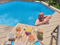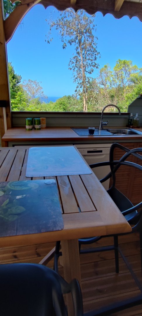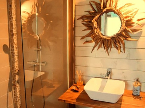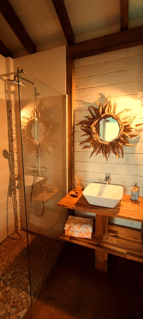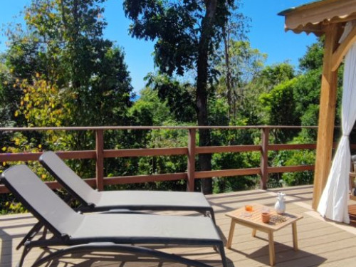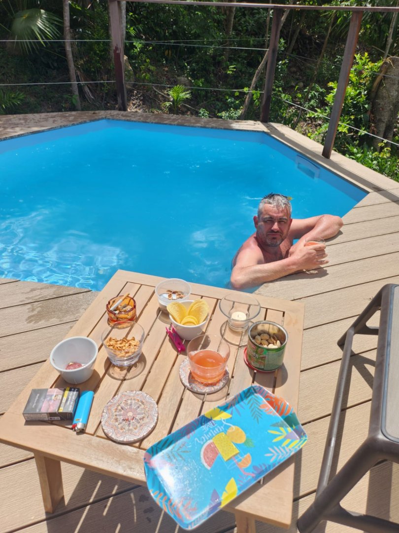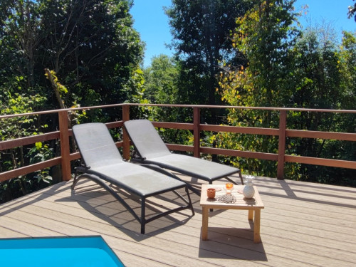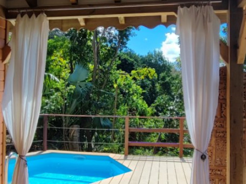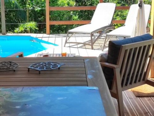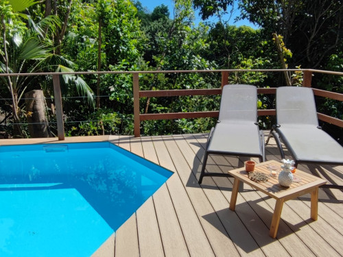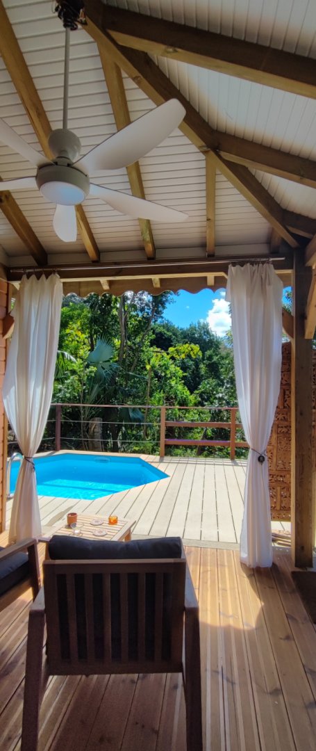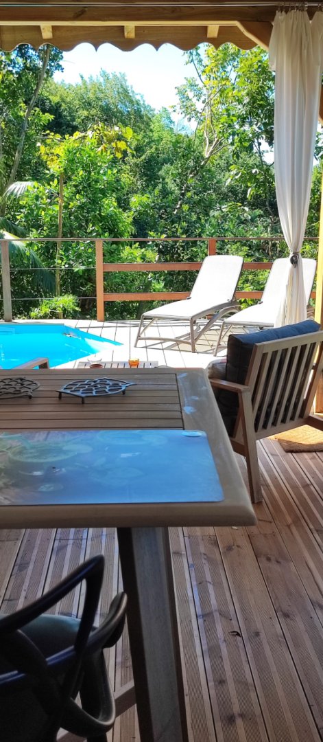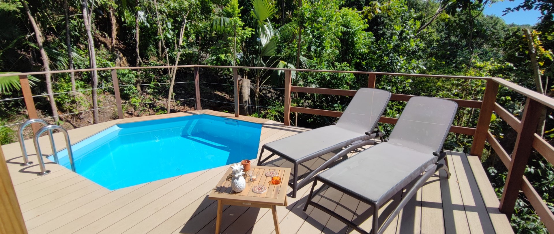 Sa terrasse extérieure de 24 m² avec bassin hexagonal permet de se rafraîchir, ses transats de profiter du soleil ou de l'ombre des bois d'Inde.