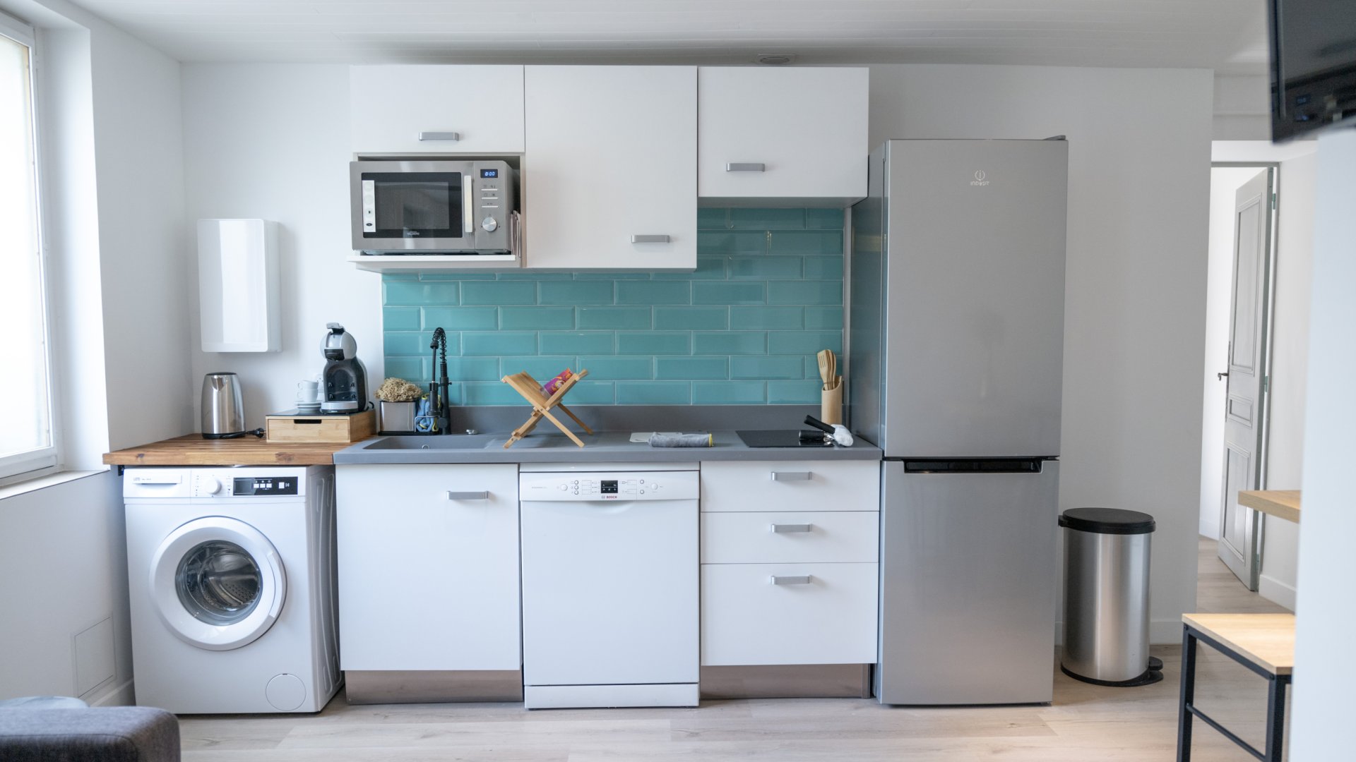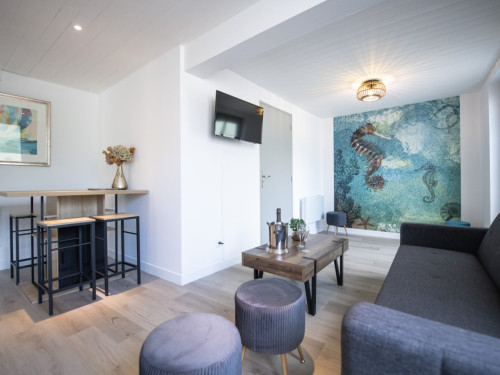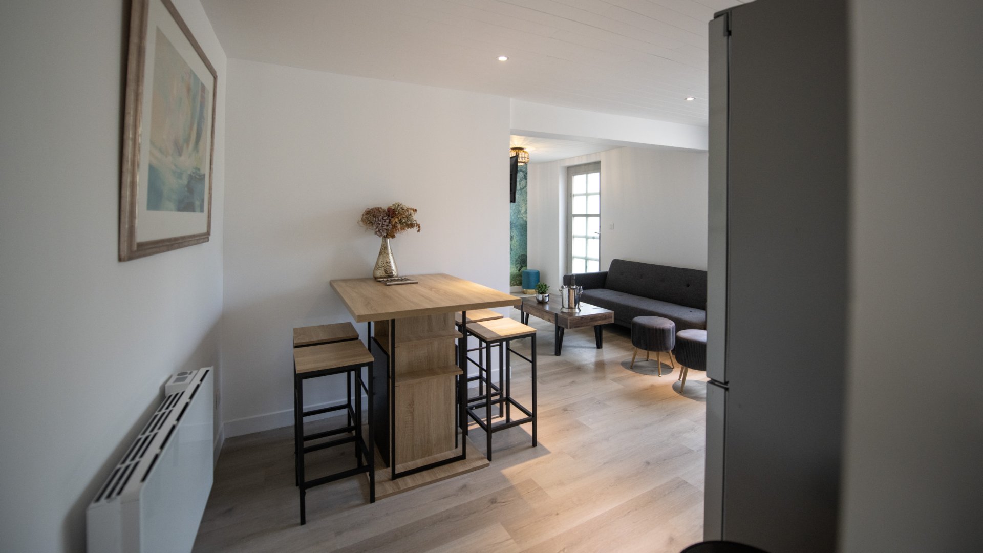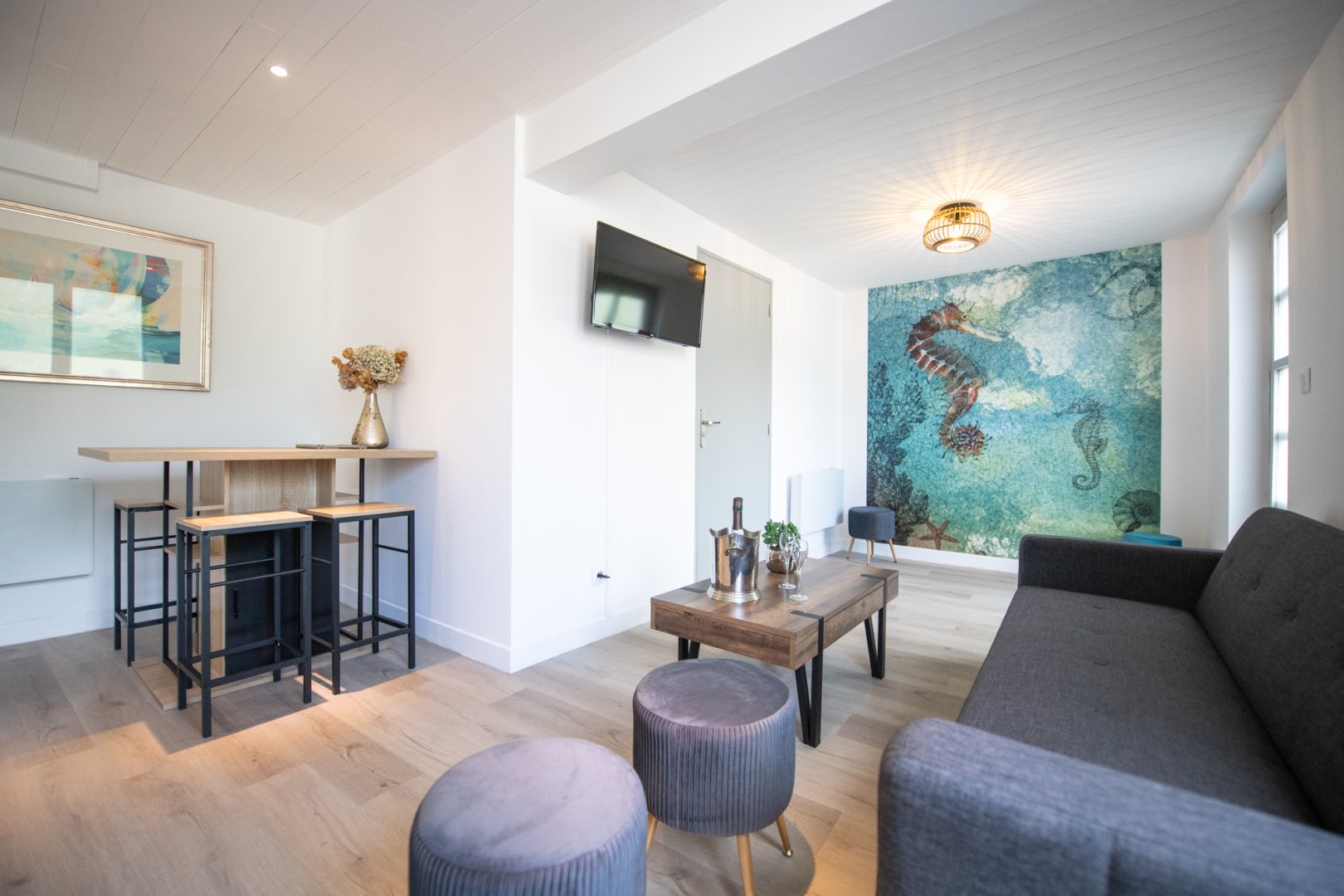 A large room including an open kitchen equipped with Senséo coffee machine, kettle, hob, combi oven, refrigerator, with dishwasher and washing machine, drying rack, a dining area with high stools and a large convertible sofa for relaxing. relax, lounge area with flat screen TV