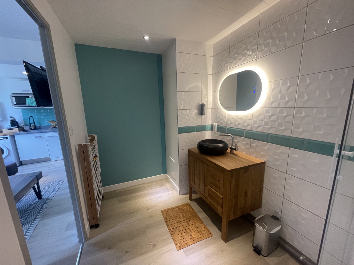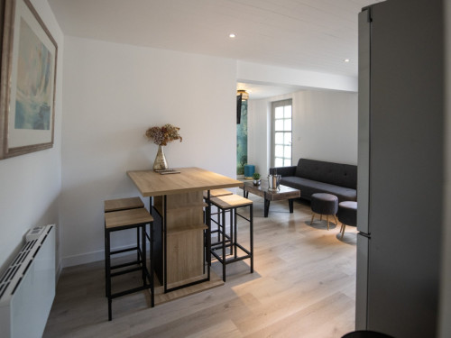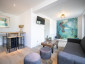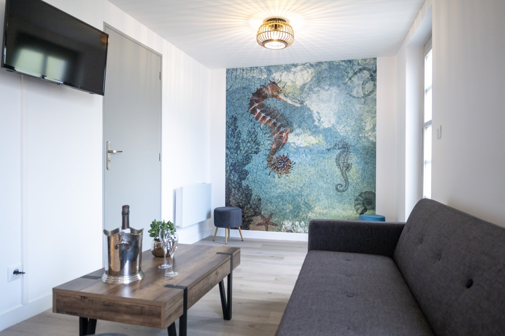 A large room including an open kitchen equipped with Senséo coffee machine, kettle, hob, combi oven, refrigerator, with dishwasher and washing machine, drying rack, a dining area with high stools and a large convertible sofa for relaxing. relax, lounge area with flat screen TV