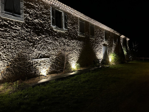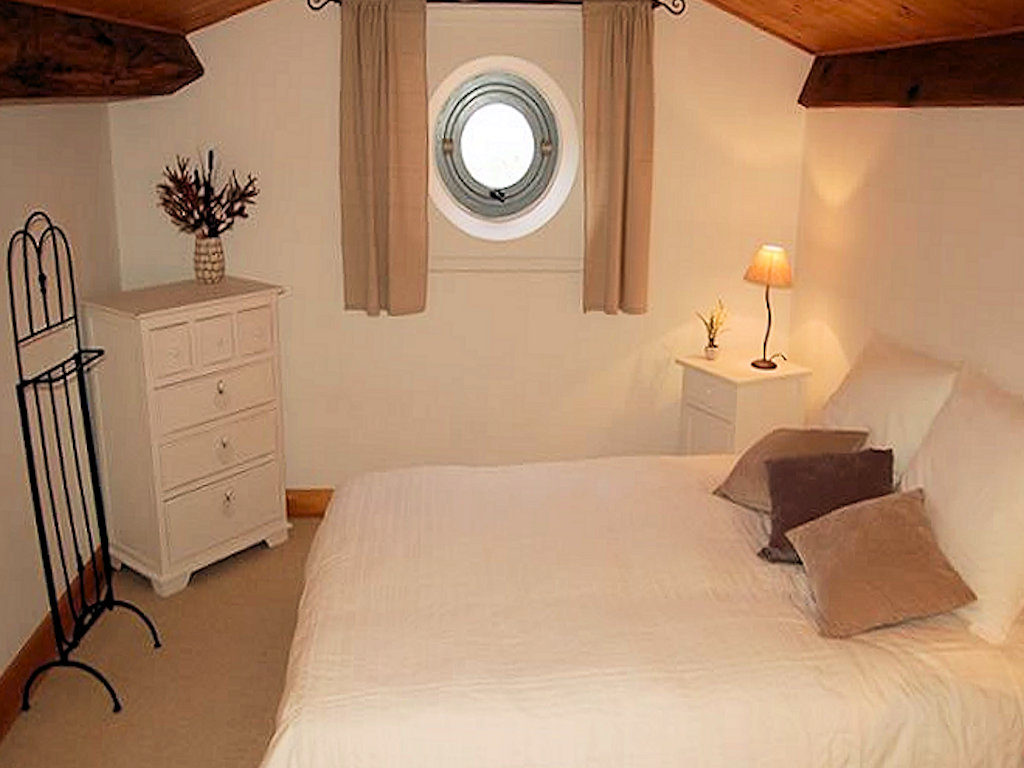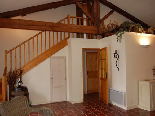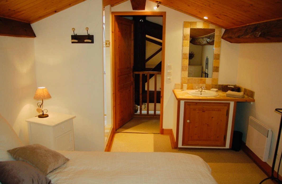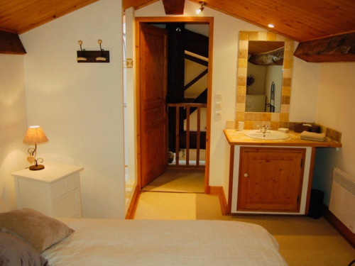 À l'étage : 1 chambre mansardée avec coin douche et lavabos, 1 lit 140.