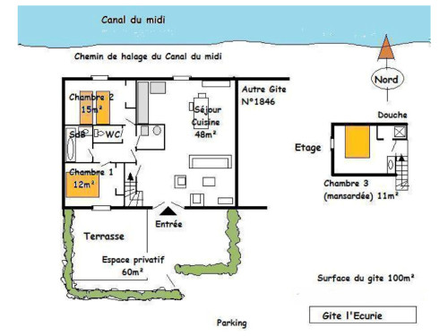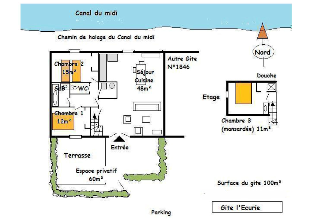 Gîte comprenant : séjour TV et cuisine salle à manger donnant sur le jardin et la terrasse sud, mobilier de jardin et barbecue, 2 chambres donnant l'une sur les berges du Canal du Midi et l'autre sur la terrasse, 1 lit 140 et 2 lits 90, une salle d'eau avec un WC et buanderie.