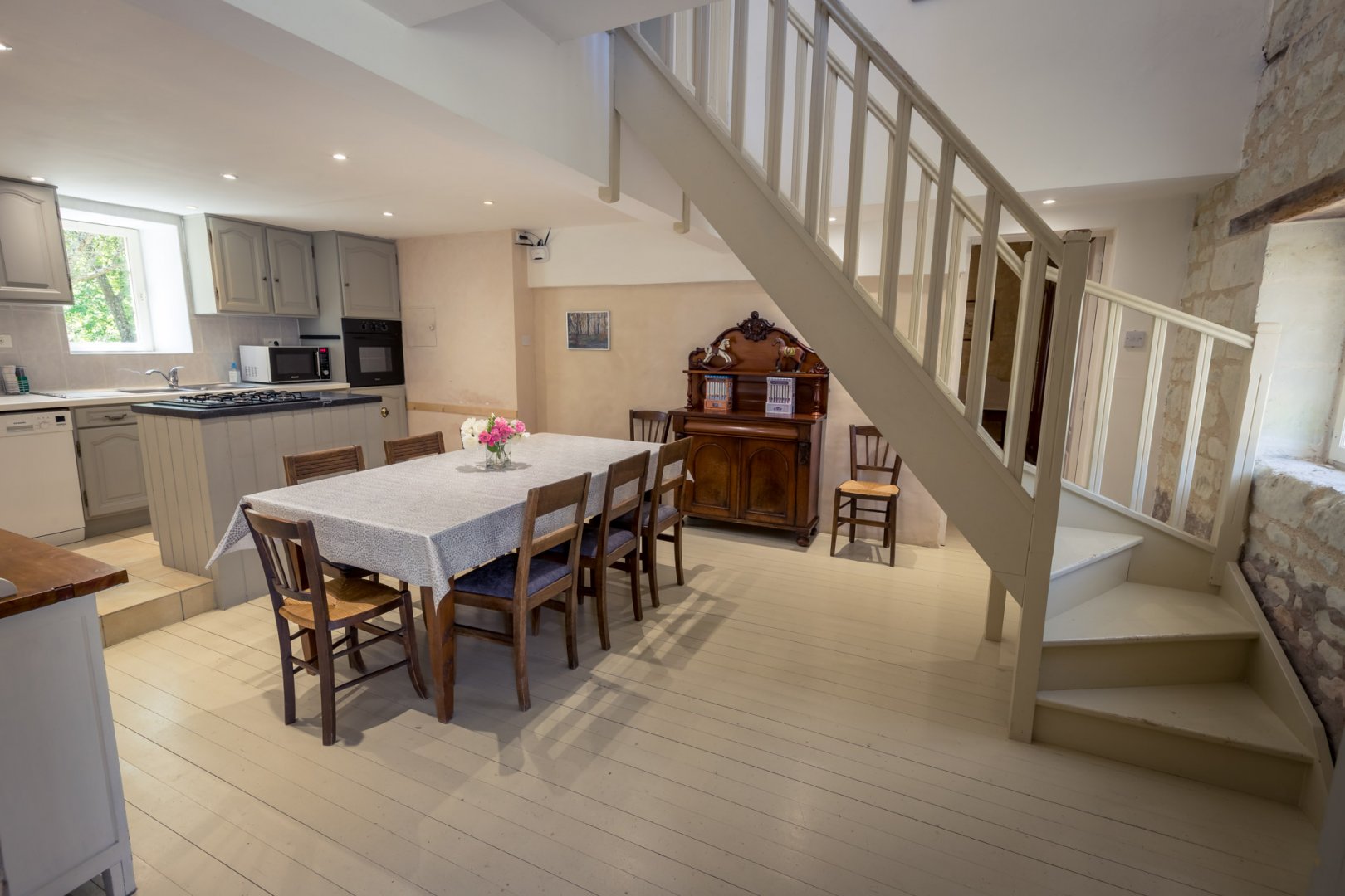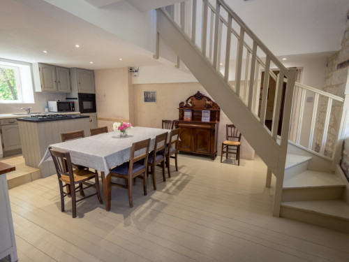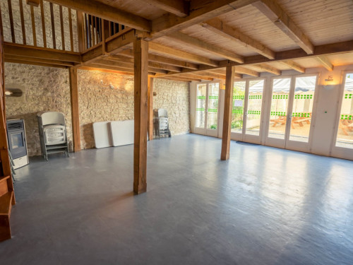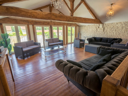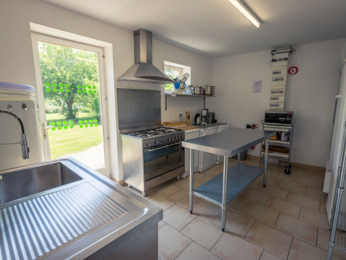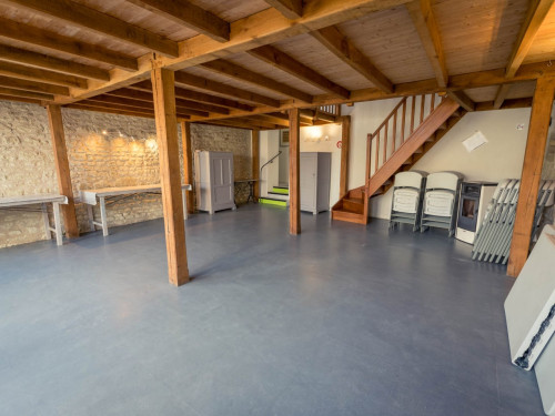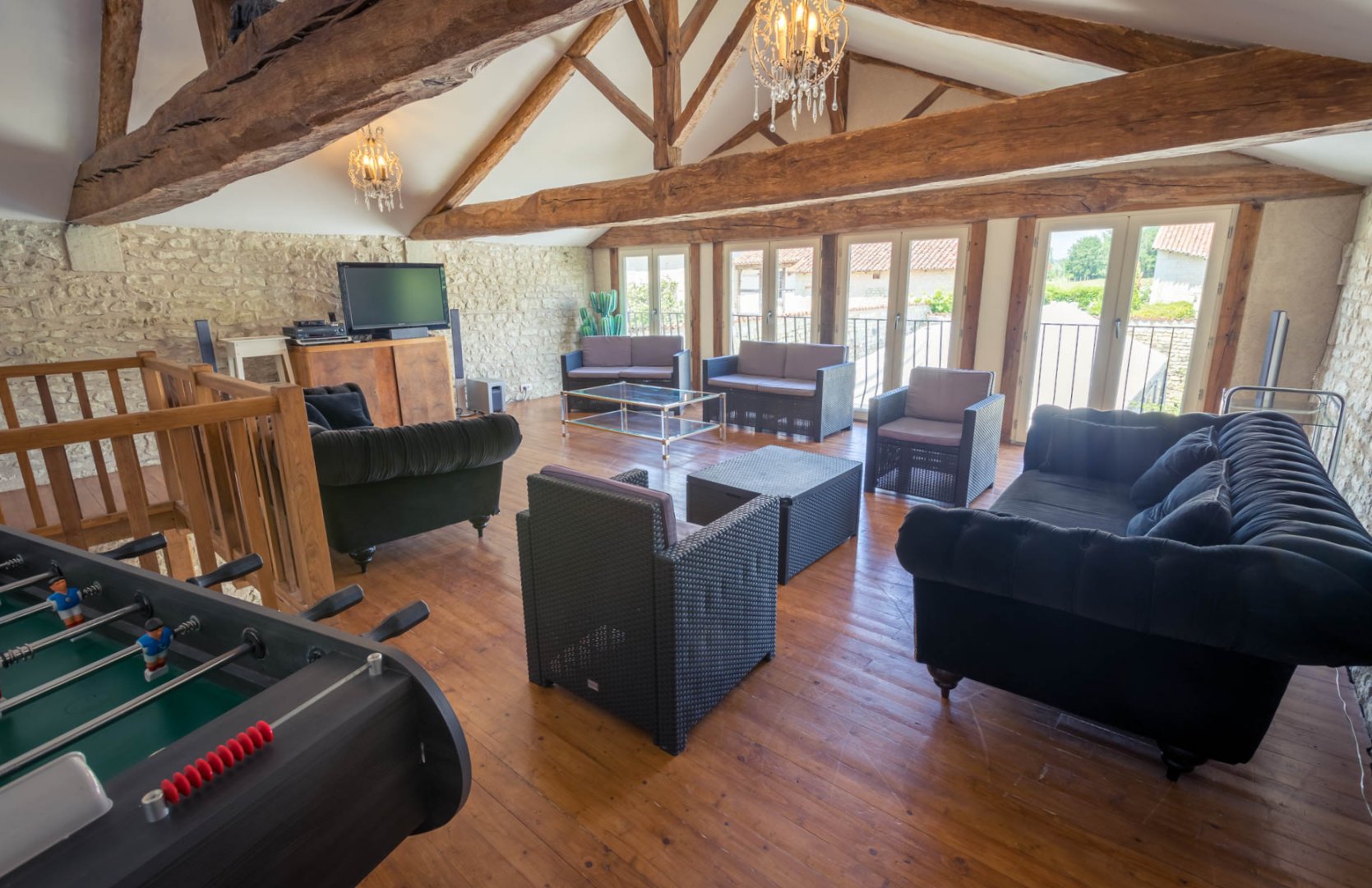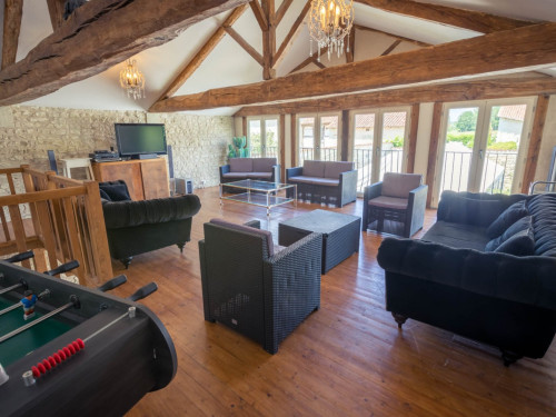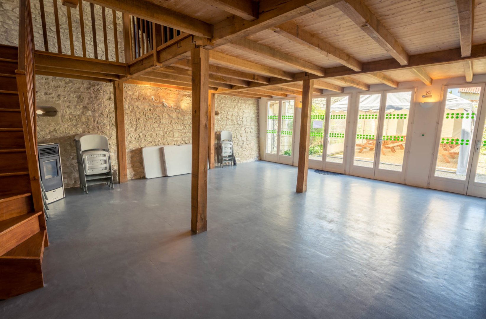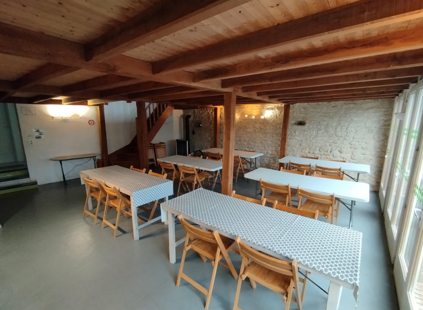 L'espace commun La Sente avec une salle à manger de 50 m² équipée tables, chaises, vaisselle, un salon mezzanine de 50 m² avec TV DVD et babyfoot, une cuisine équipée, WC, vous est également proposé pour la location du domaine complet.