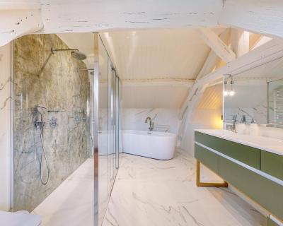Une cuisine équipée d’un réfrigérateur, d’un lave-vaisselle et d’un four est également présente dans certains logements.