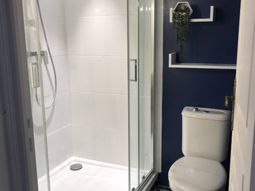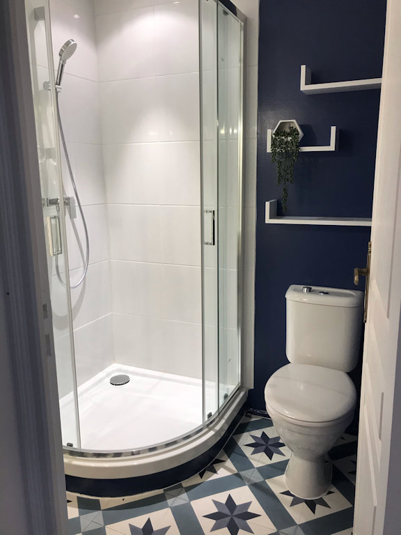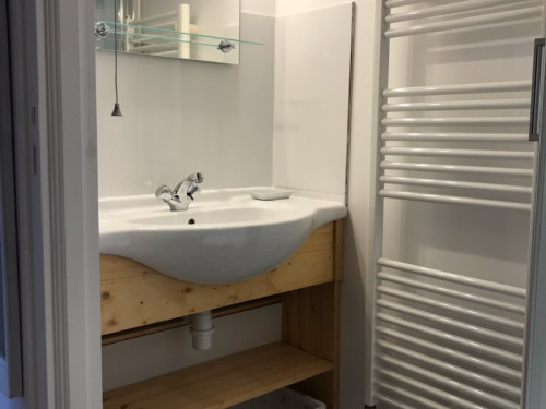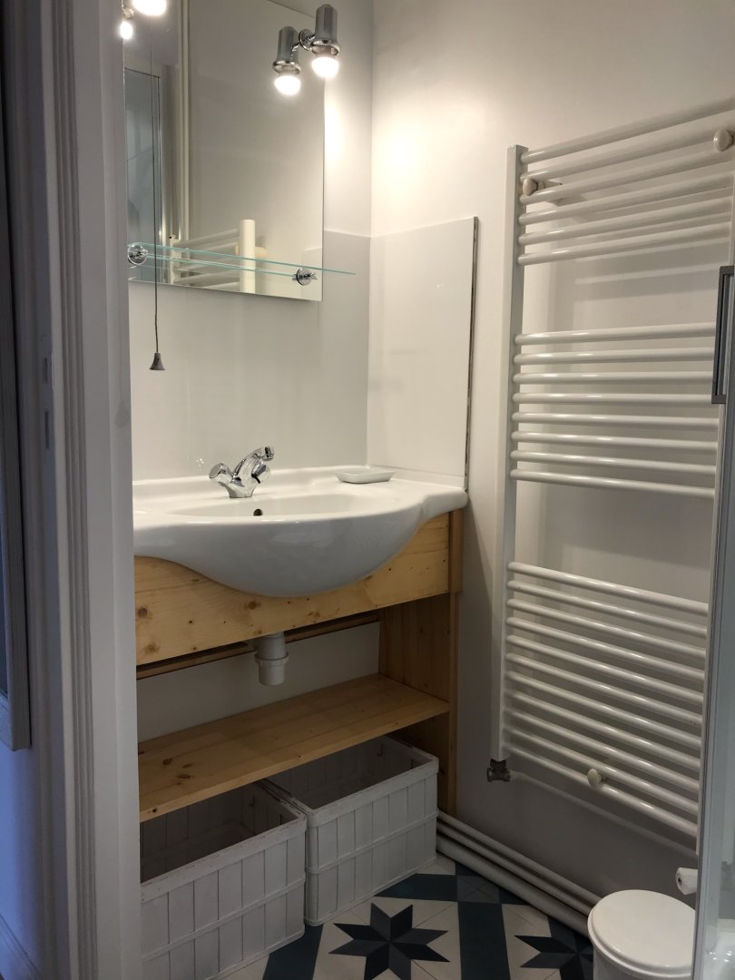salle de douche claire et agréable avec douche, vasque, wc et sèche-serviettes .