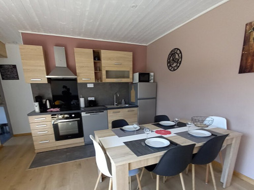 - une cuisine équipée d’un four électrique, lave-vaisselle, plaque à induction, frigo-congélateur, micro-ondes, cafetière Senseo, filtre et bouilloire