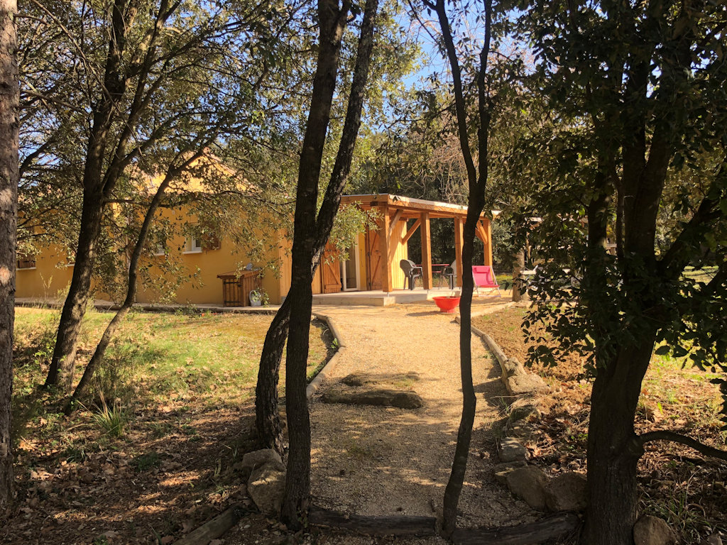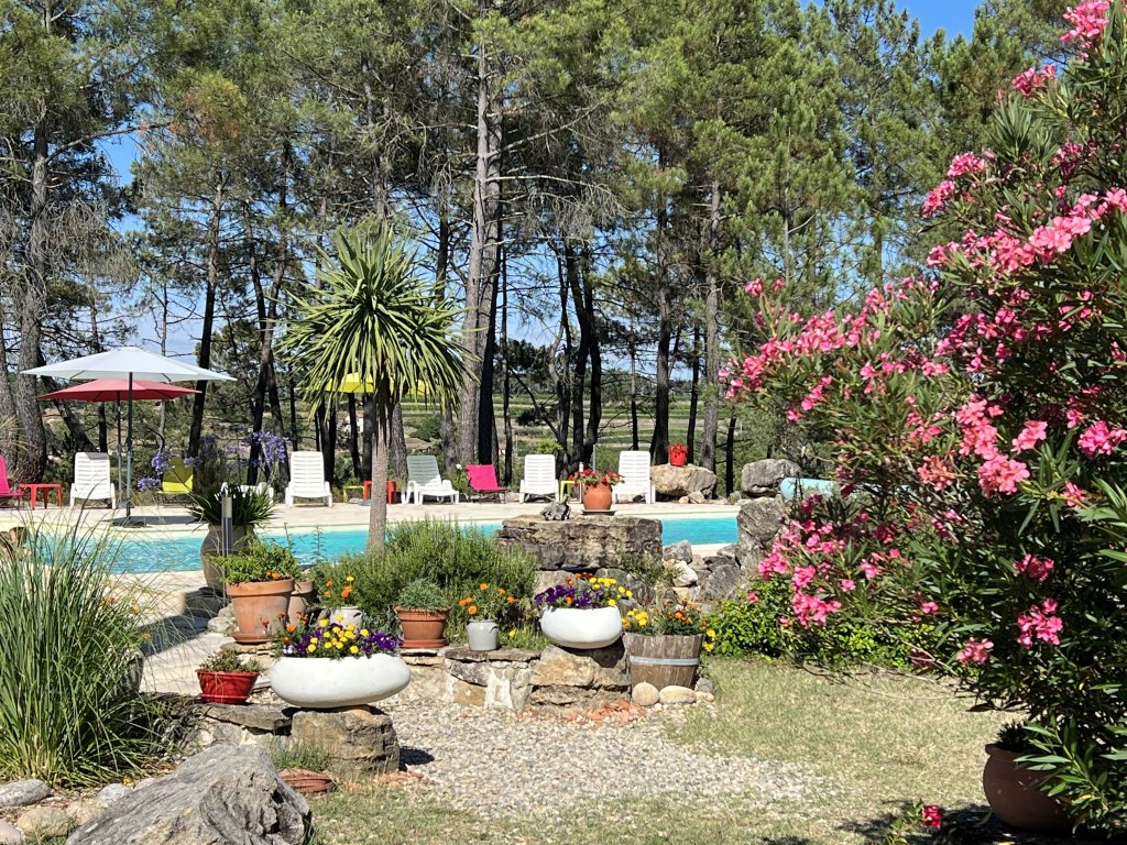 Grands espaces verts, beaucoup d’ombrage, grande piscine de 8 x 16 m à l’écart donnant sur les monts d’Ardèche.