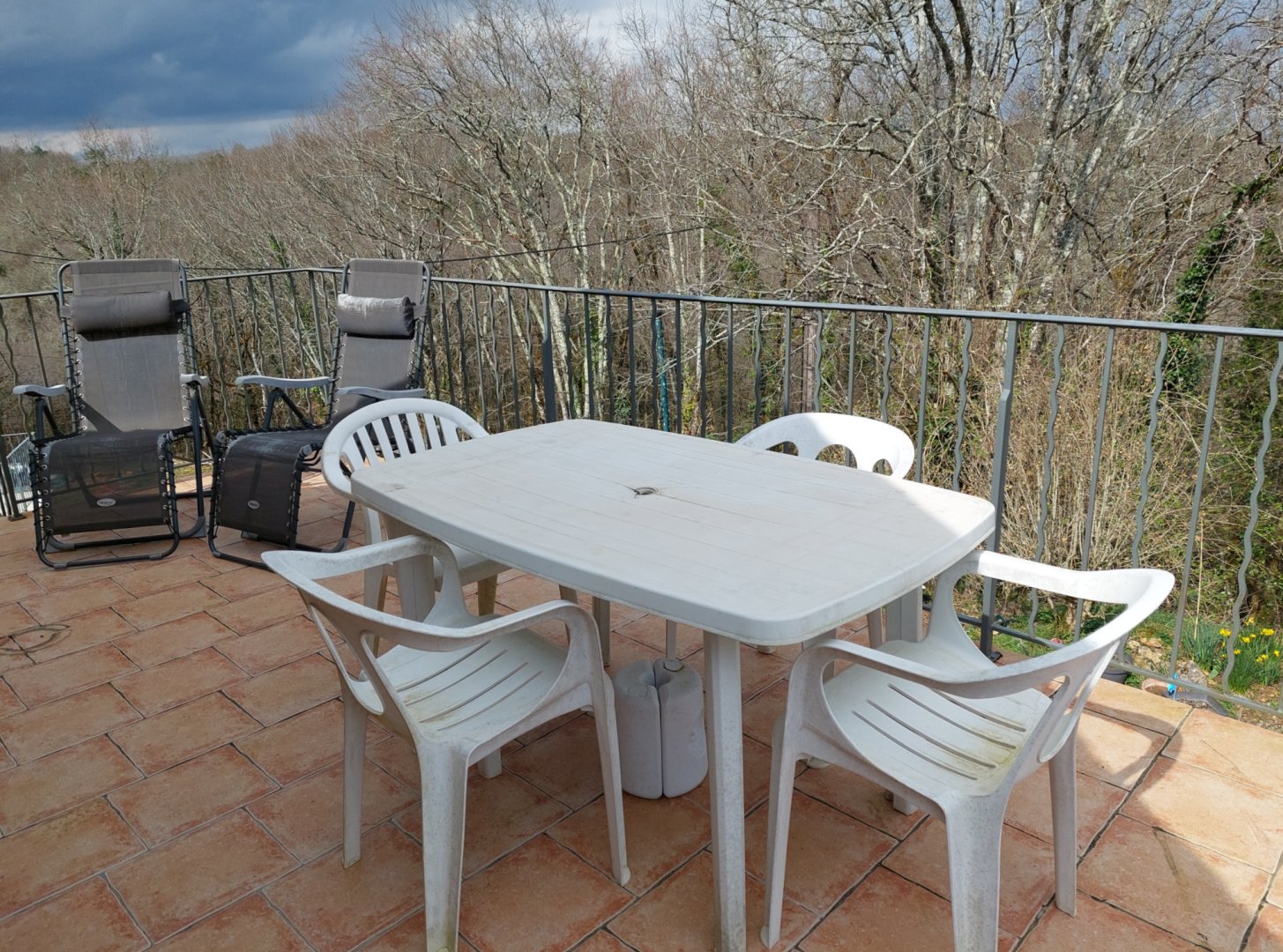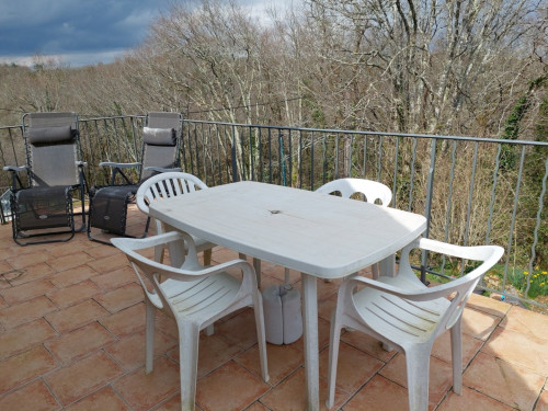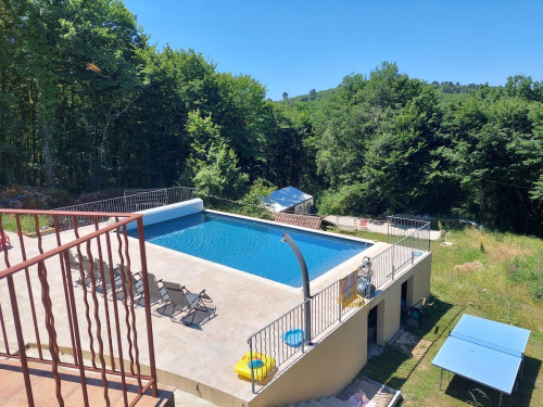 Terrasse donnant sur la piscine, le jardin et les bois.