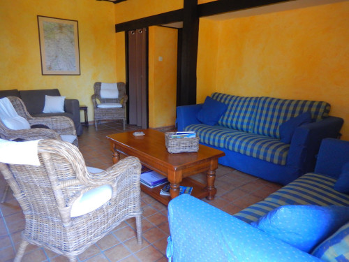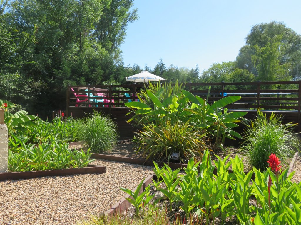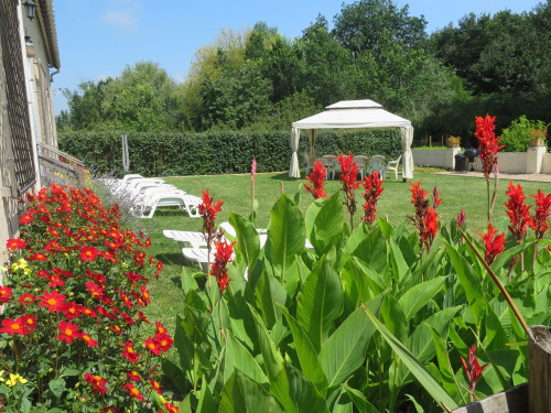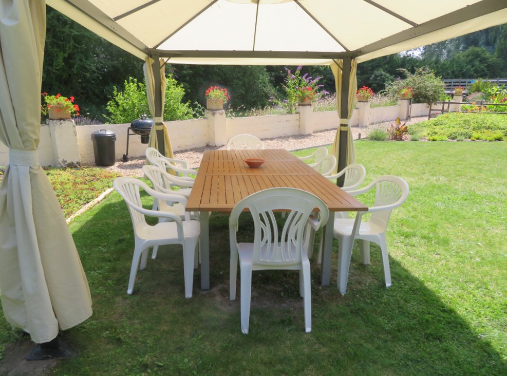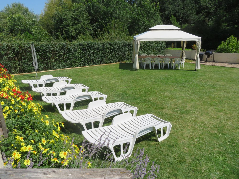 • Les portes-fenêtres du salon donnent accès à un grand jardin privé orienté au sud, avec transats, pergola, table, chaises et barbecue au charbon