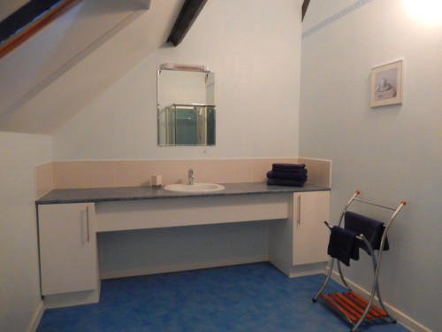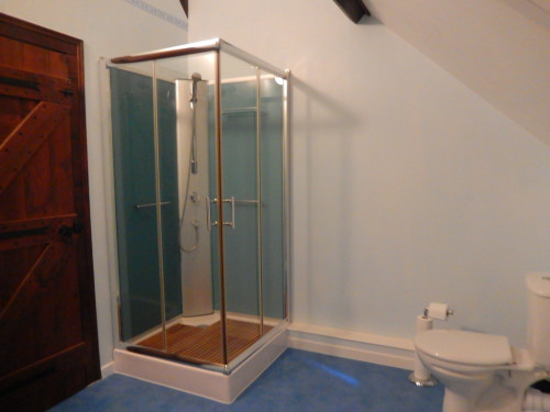 • Salle de bain avec cabine de douche, lavabo, toilette et chauffage.