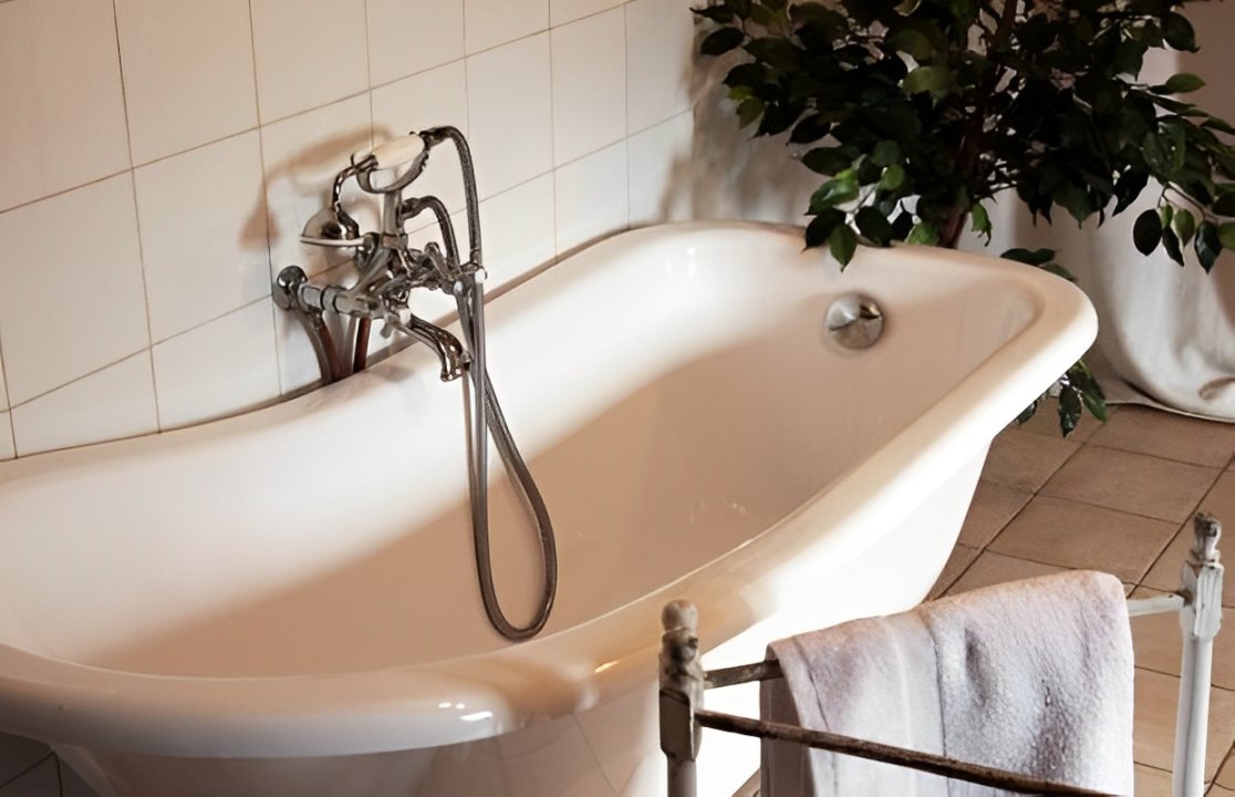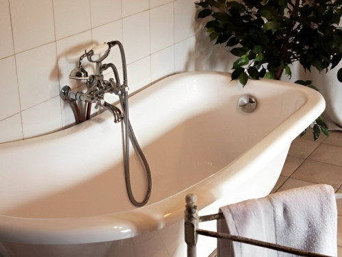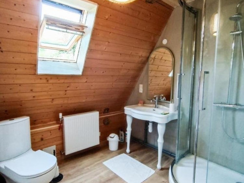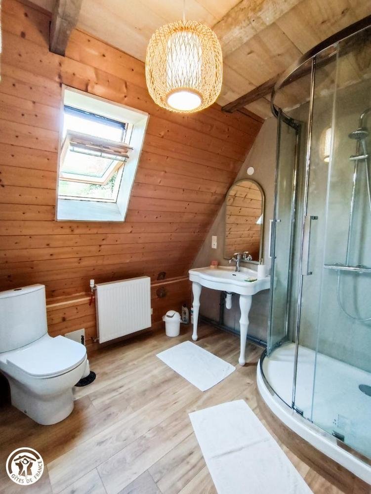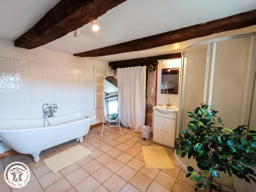 Au niveau -1, salle de bains (cabine de douche, baignoire de style 'rétro', lavabo et WC séparé), avec une porte donnant sur une terrasse couverte.