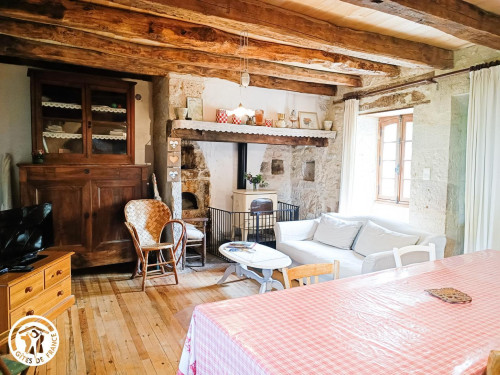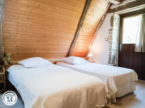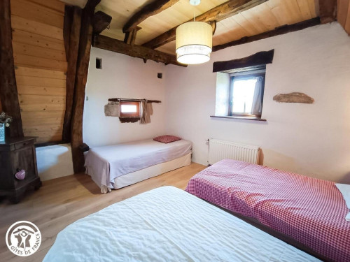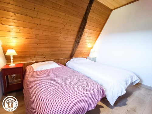 Quelques marches donnent accès à une terrasse semi-couverte, puis à une cuisine indépendante, une grande pièce à vivre (poêle à bois), coin salon / salle à manger et coin détente avec 2 lits 1 pers. en 0,90m. Une chambre séparée avec un lit 2 pers. en 1,40m, buanderie et WC séparé.