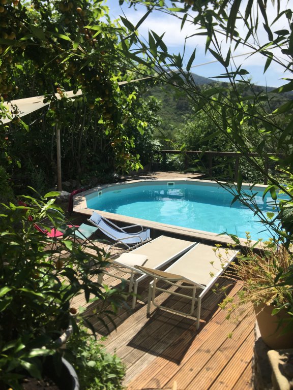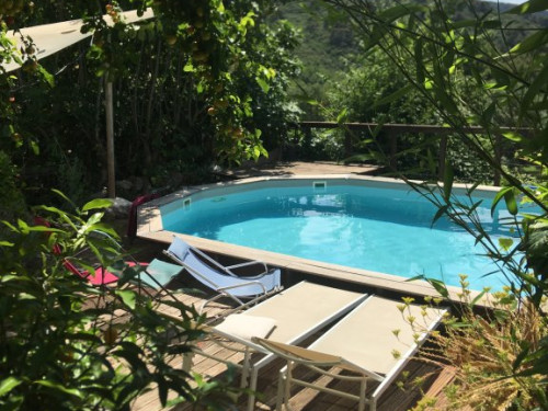 La piscine est en bois et semi-enterrée, elle mesure 6 x 4 m et 1,50 m de profondeur.