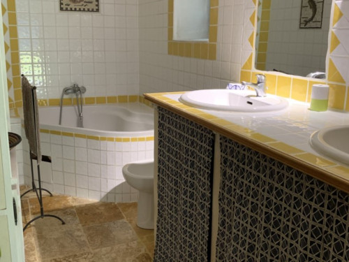 Au 1er étage : une grande chambre avec salle de bain et un lit en 160x200, une chambre avec un lit en 140x200, une salle de bain et un wc séparé.