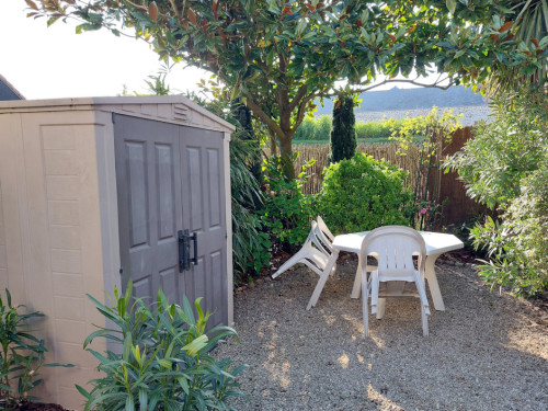 Maison de pêcheur en granit totalement rénovée pour 6 personnes avec cour arborée et fleurie (parking) et salon de jardin entouré de végétation dépaysante (palmiers, magnolia, laurier rose, pergola...)