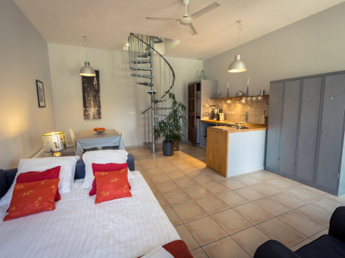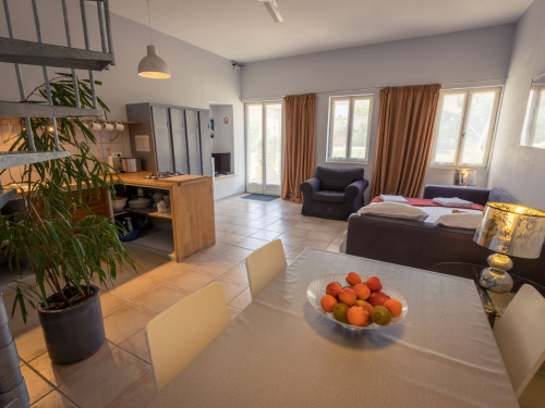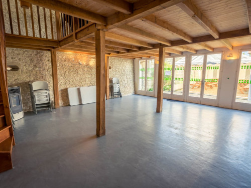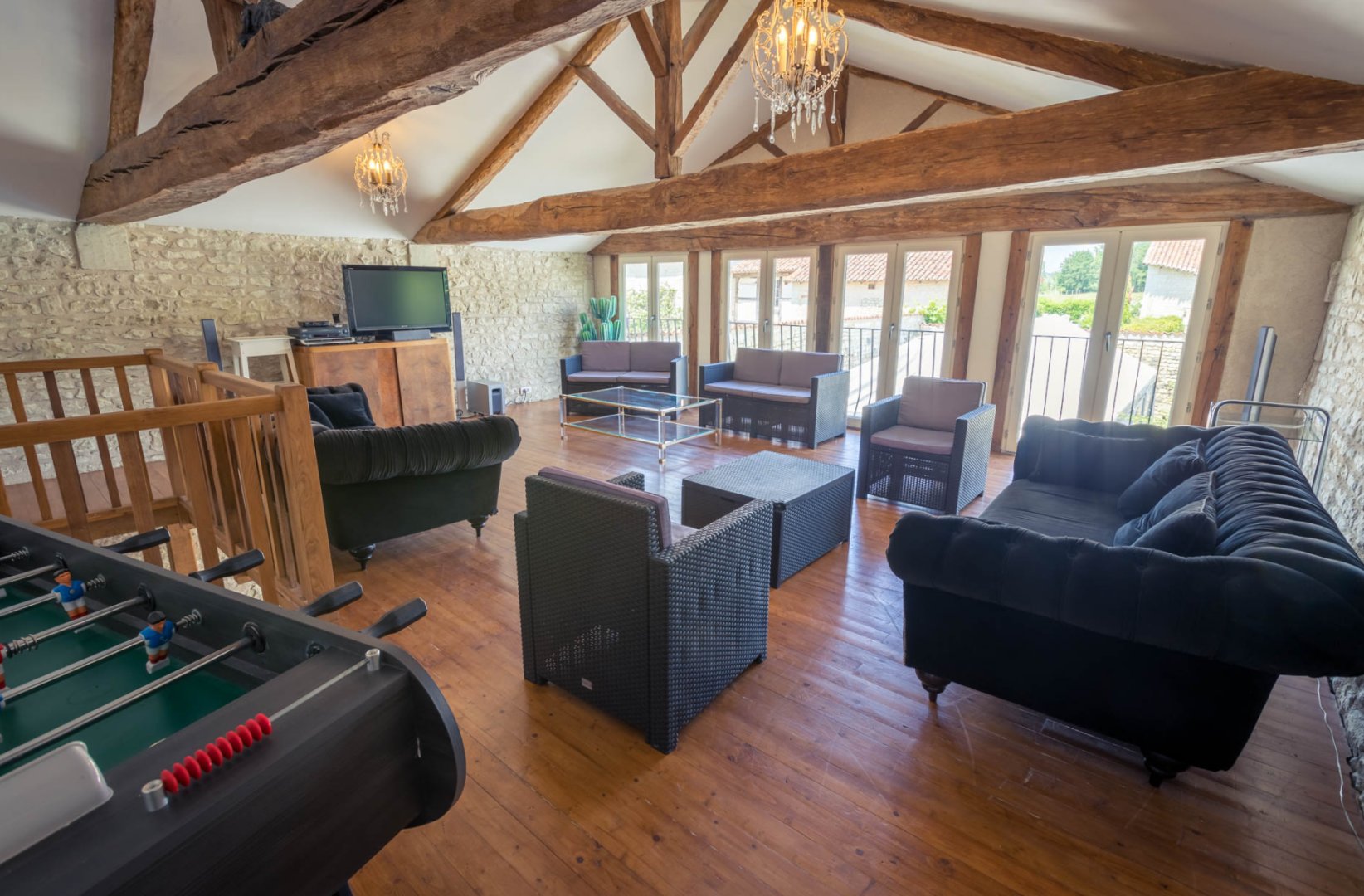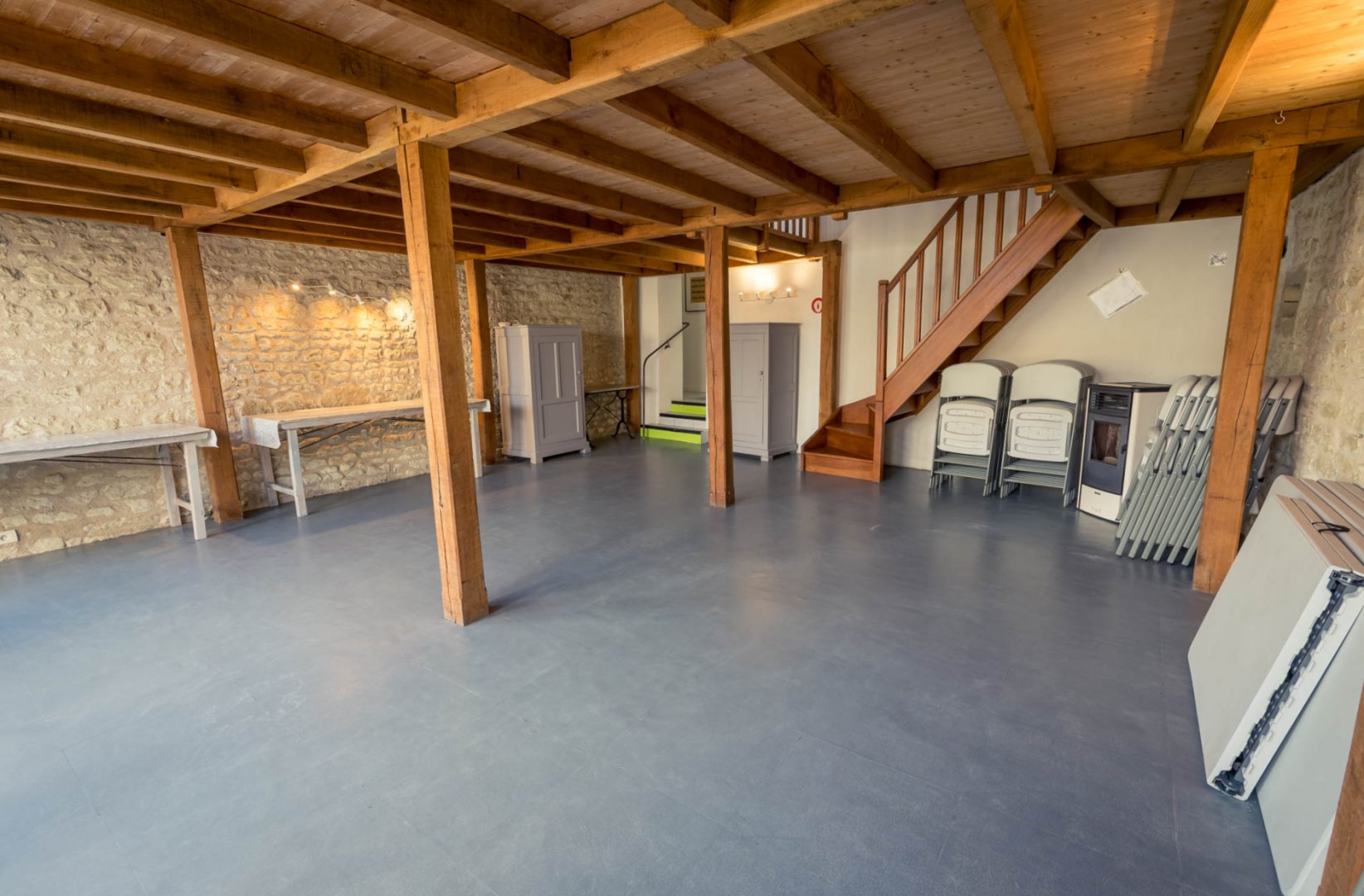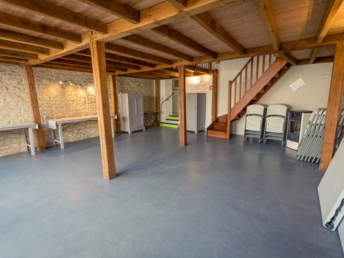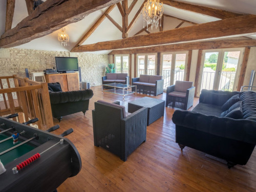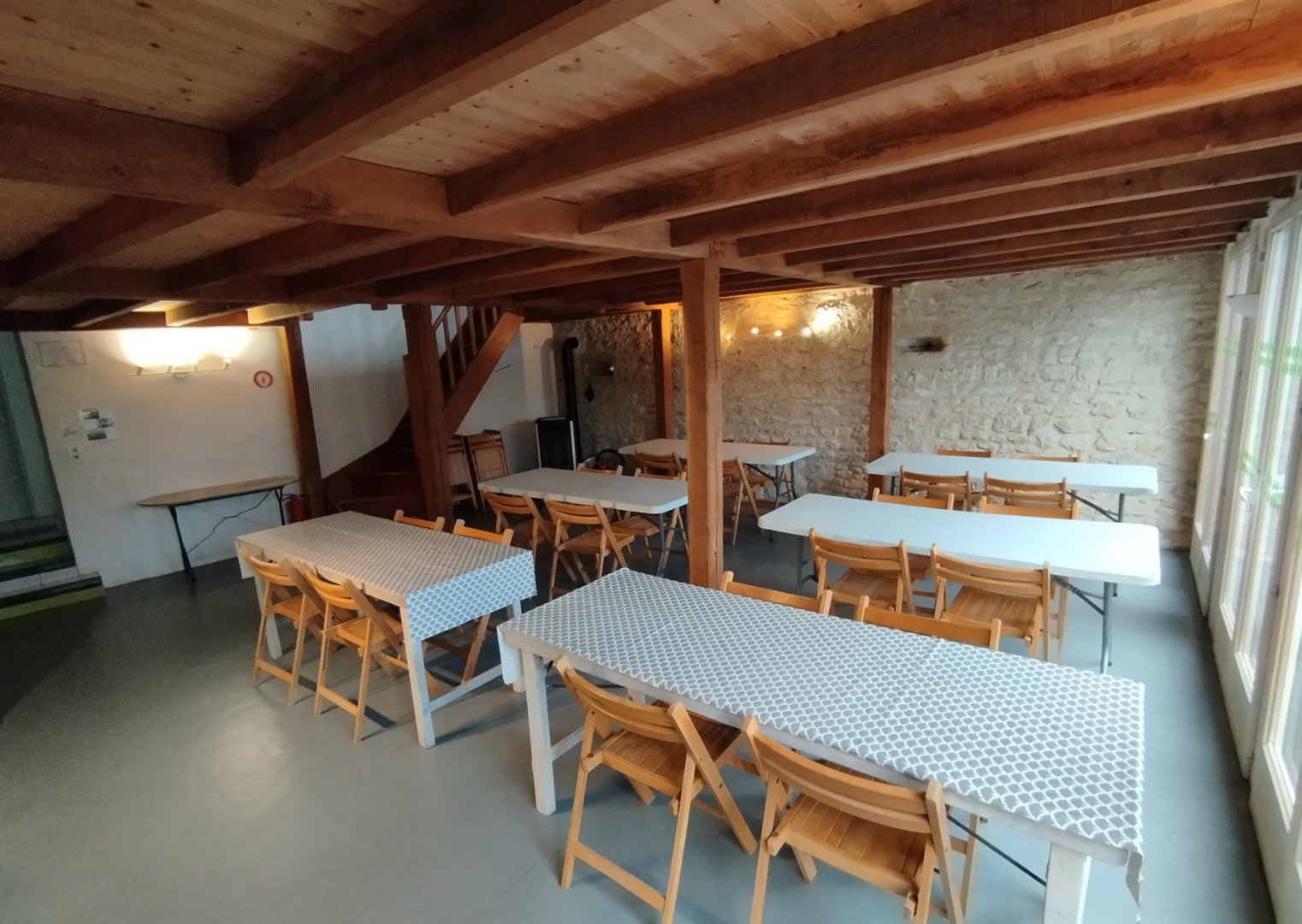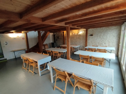L'espace commun La Sente avec une salle à manger de 50 m² équipée tables, chaises, vaisselle, un salon mezzanine de 50 m² avec TV DVD et babyfoot, une cuisine équipée, WC, vous est également proposé pour la location du domaine complet.