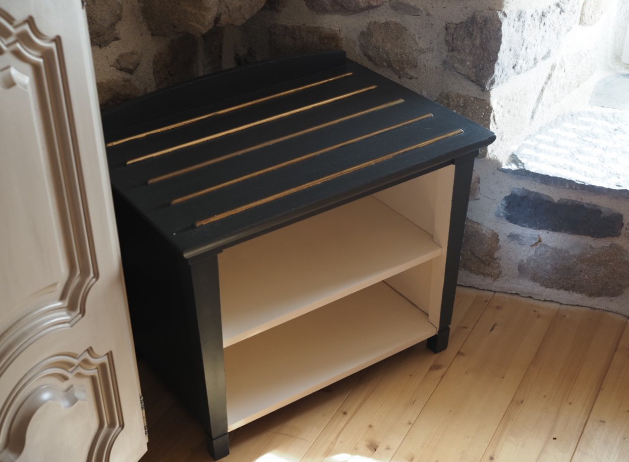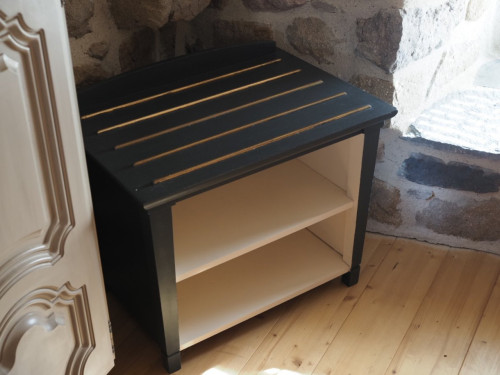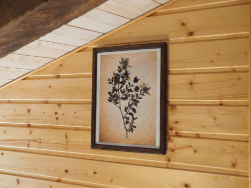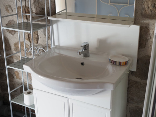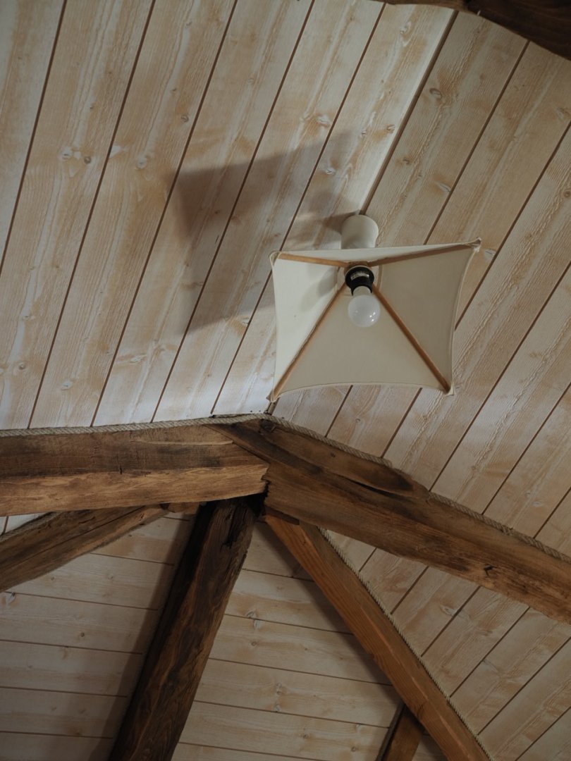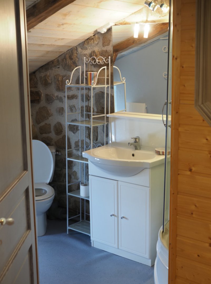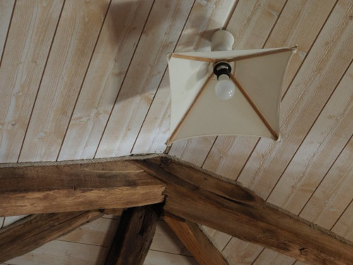À l'étage une chambre légèrement mansardée avec les poutres apparentes