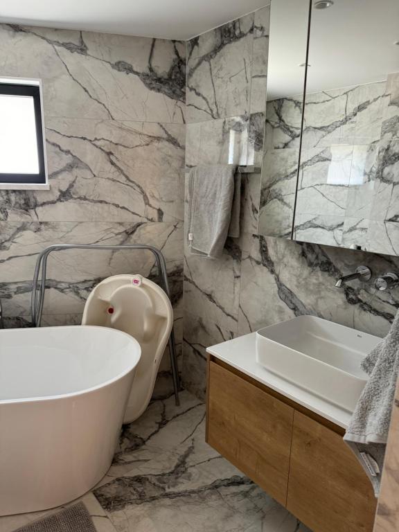 The spacious villa with a terrace and garden views features 3 bedrooms, 2 living rooms, a flat-screen TV, an equipped kitchen with a dishwasher and an oven, and 4 bathrooms with a walk-in shower. Towels and bed linen are provided in the villa. For added privacy, the accommodation has a private entrance and soundproofing.