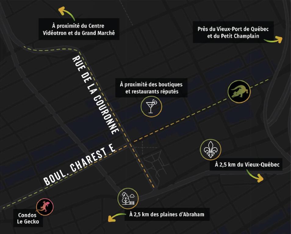 Popular points of interest near Le 908, L'adresse de la vie urbaine include Vieux Quebec Old Quebec, Fairmont Le Chateau Frontenac and Quartier du Petit Champlain. Québec City Jean Lesage International Airport is 12 km away.