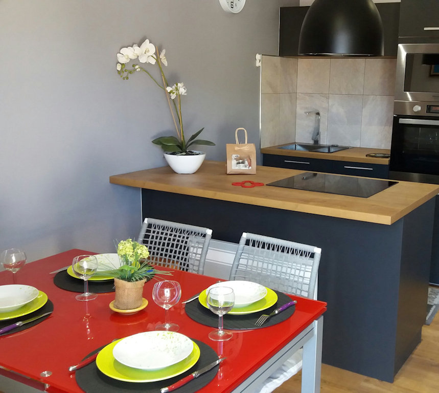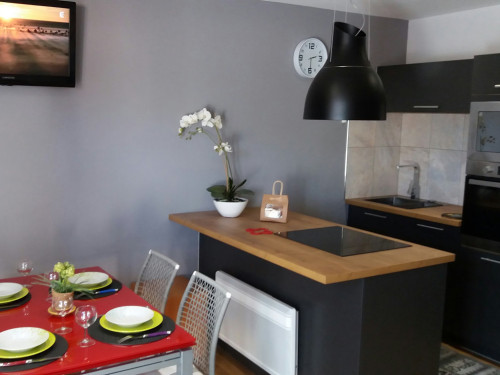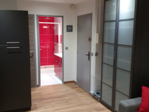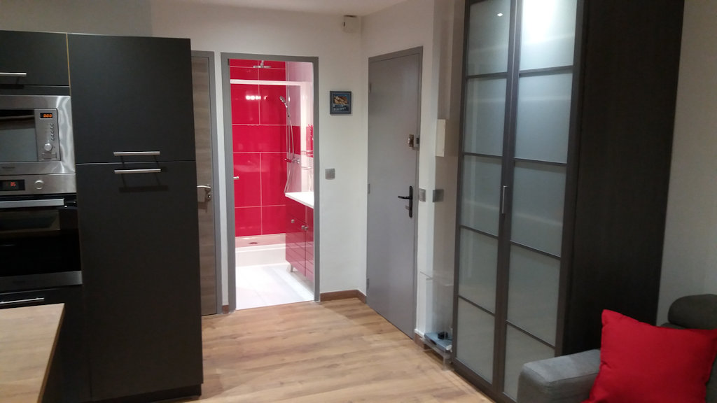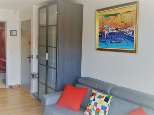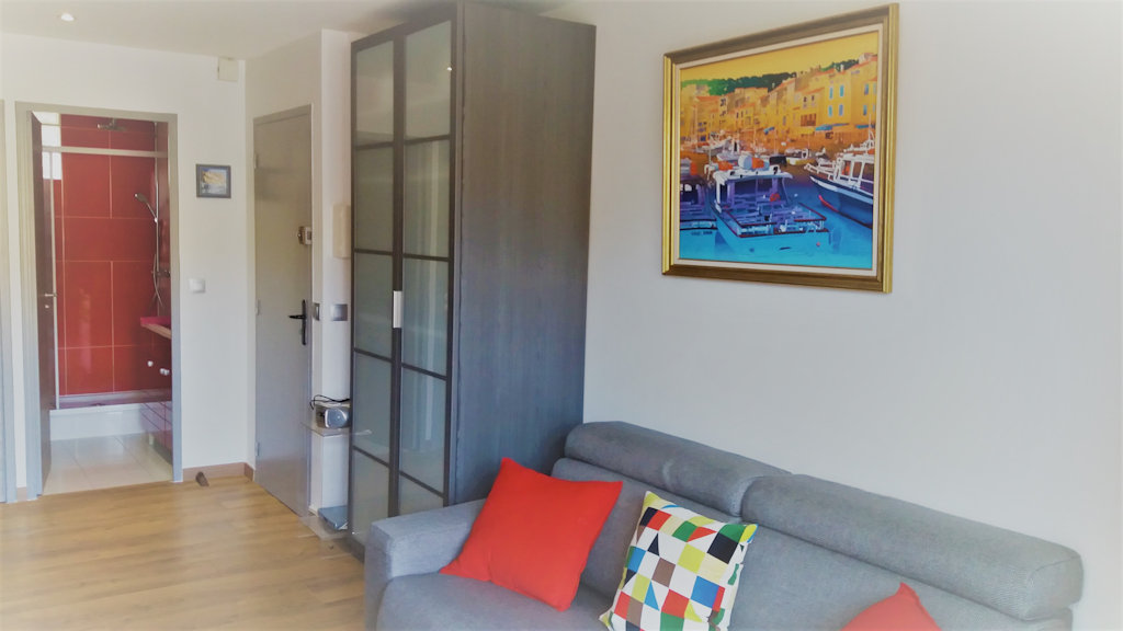 Une entrée donnant sur Salon/Séjour avec Canapé Lit Rapido, Armoire de rangement, télé écran plat mural, coin repas.