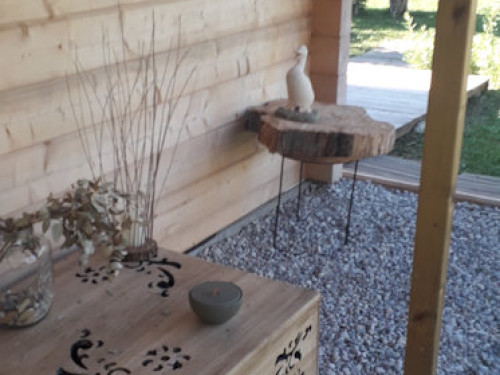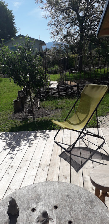 Chalet avec sa terrasse en bois, son espace détente, coin farniente (chaise longue), barbecue table de ping pong et un jeux de fléchette.