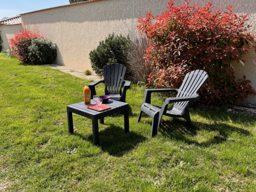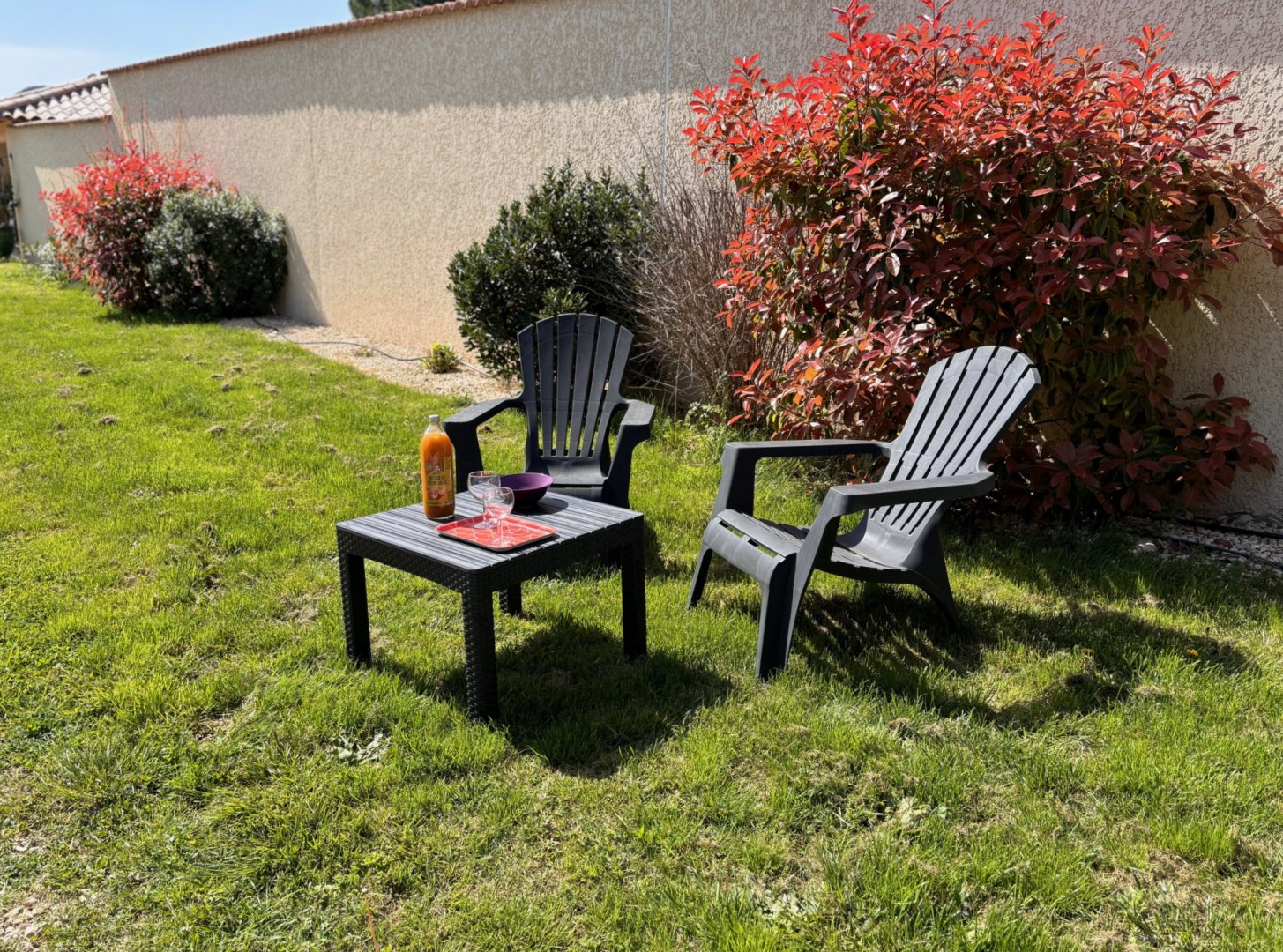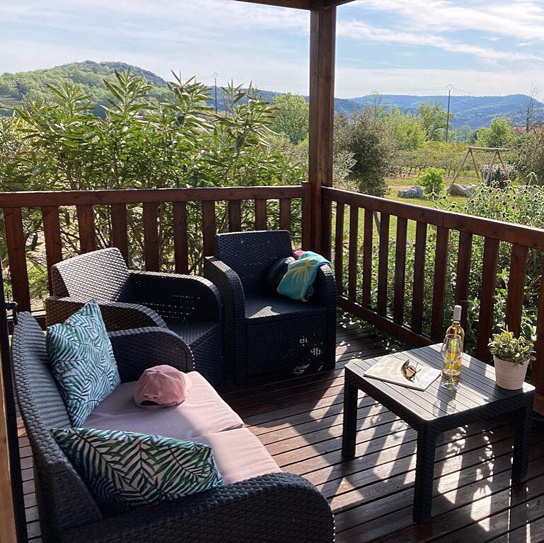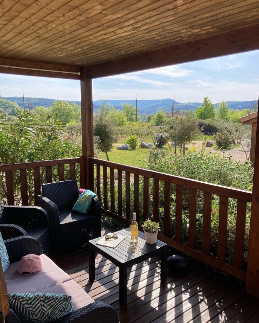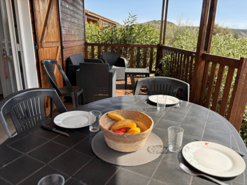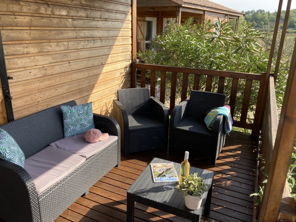 Chalet Chardonnay 36m² : Terrasse couverte de 15 m² avec salon de détente, salon de jardin, barbecue.