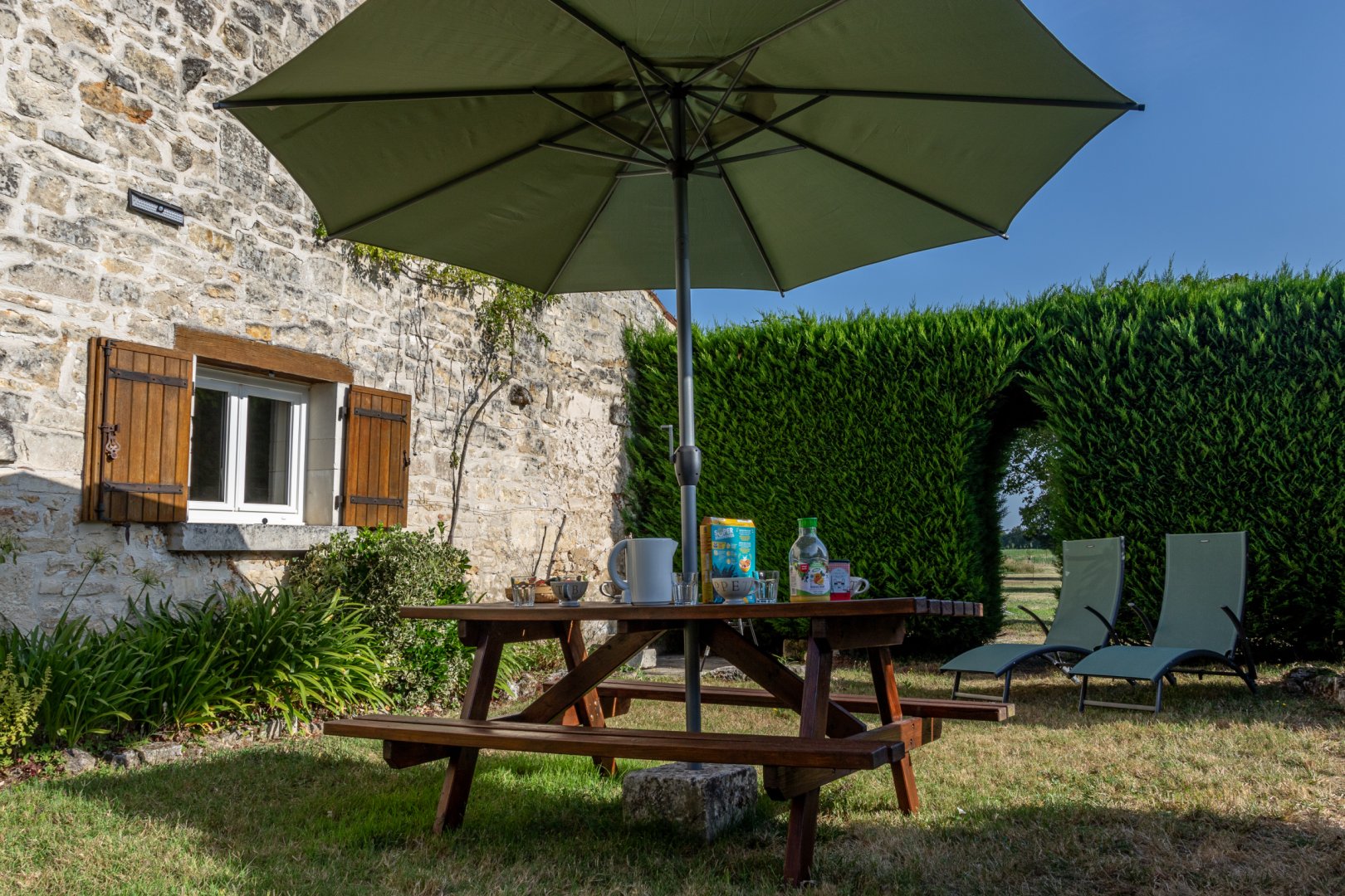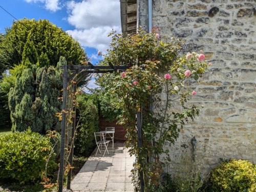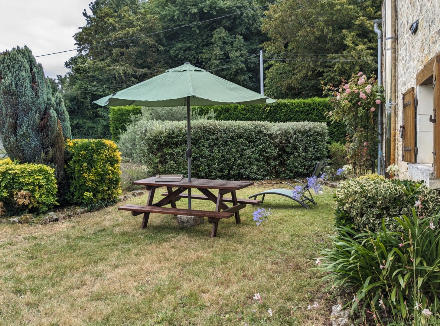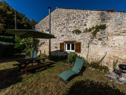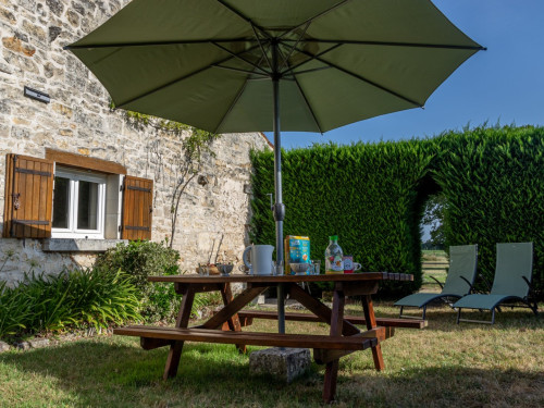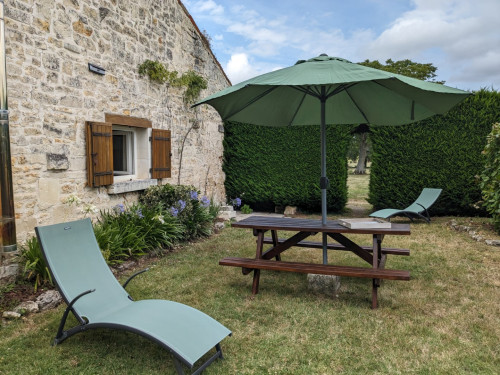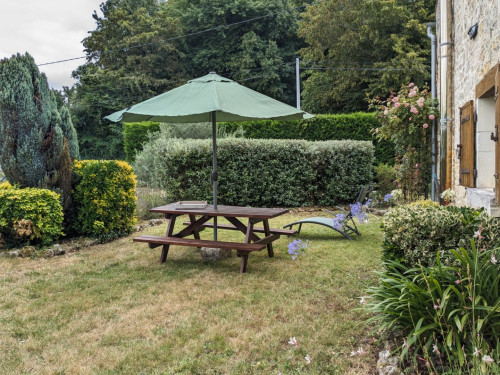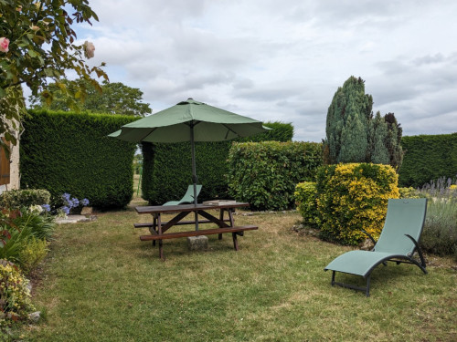 Ce gîte donne sur une terrasse et un jardin fleuri de plus de 100 m² avec table de jardin 6 places, table "tête à tête", transats et parasol.