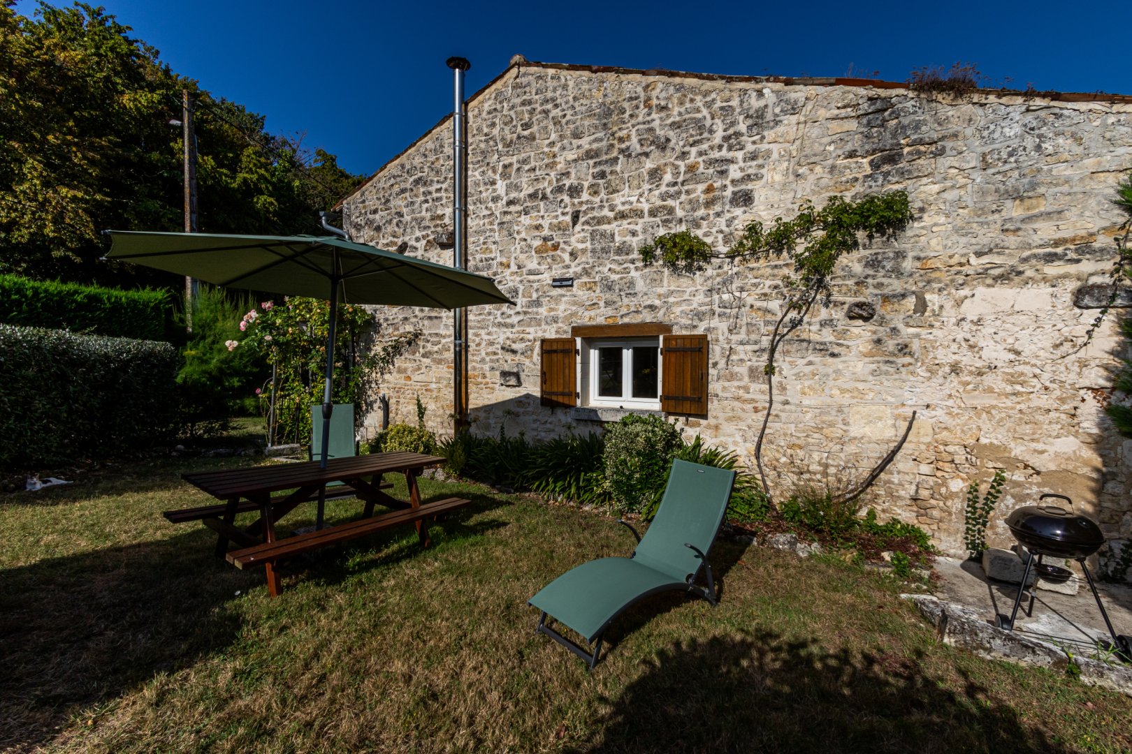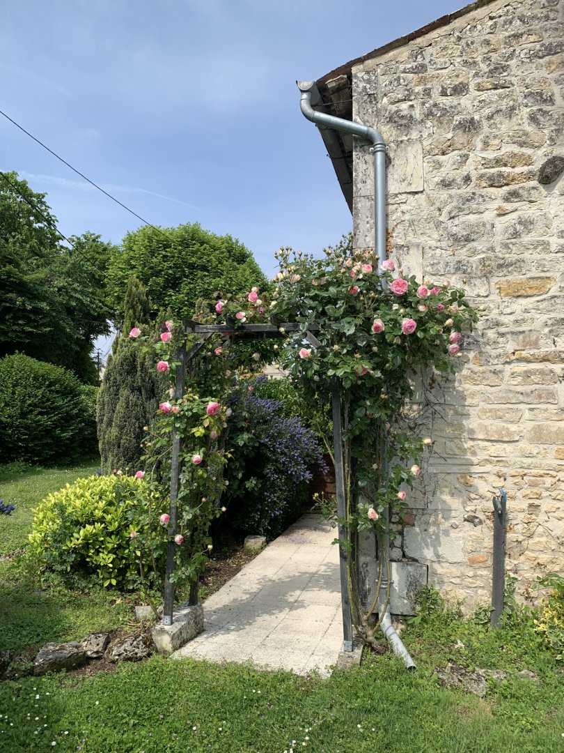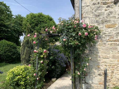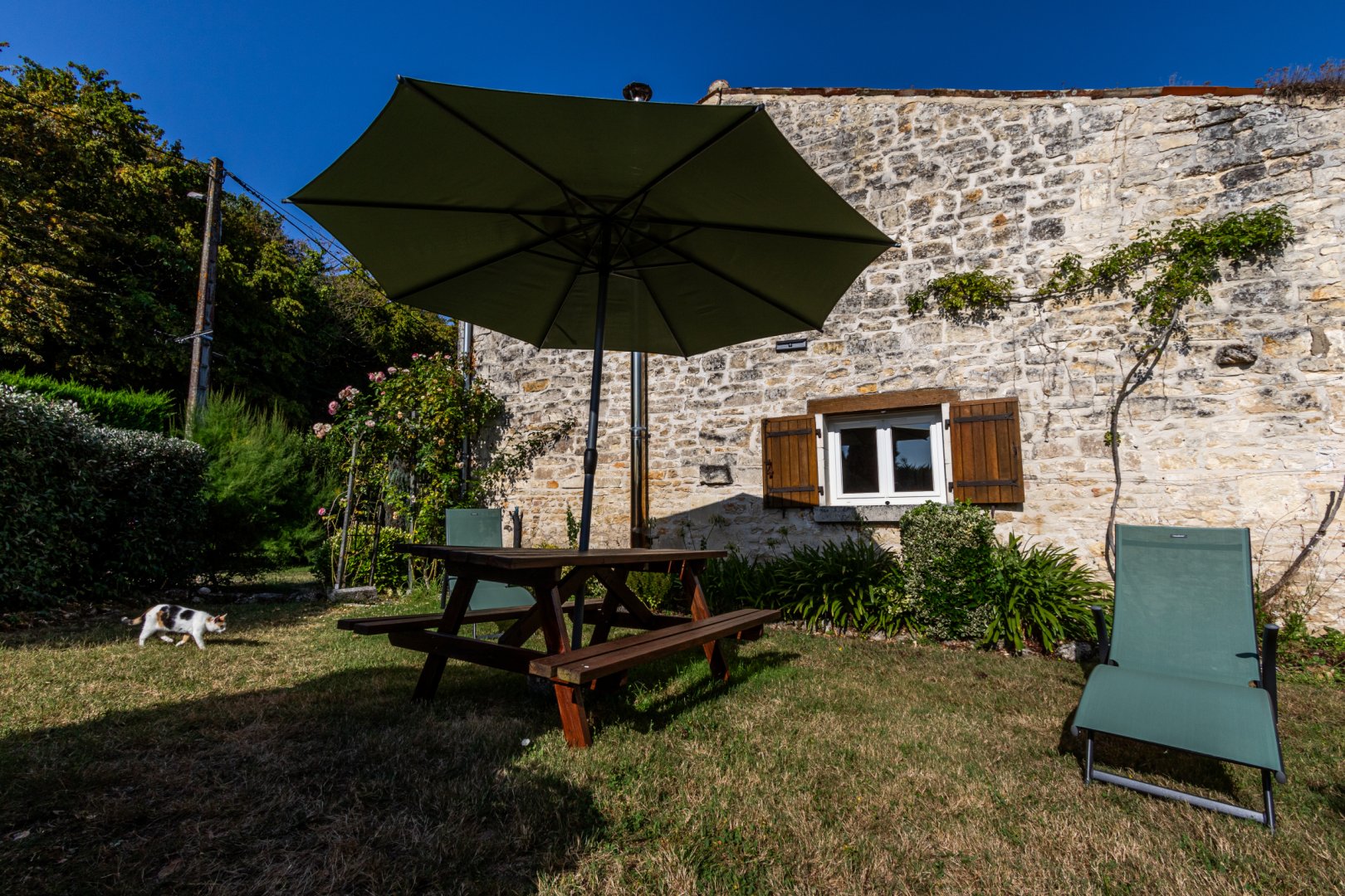 Ce gîte donne sur une terrasse et un jardin fleuri de plus de 100 m² avec table de jardin 6 places, table "tête à tête", transats et parasol.