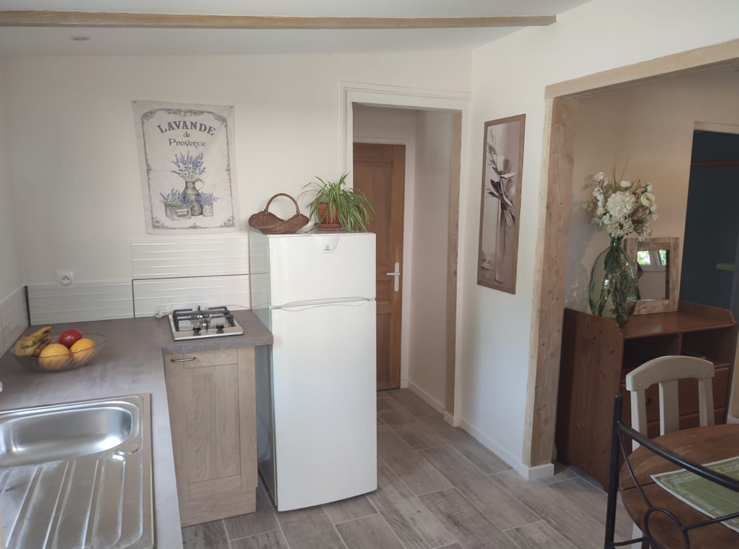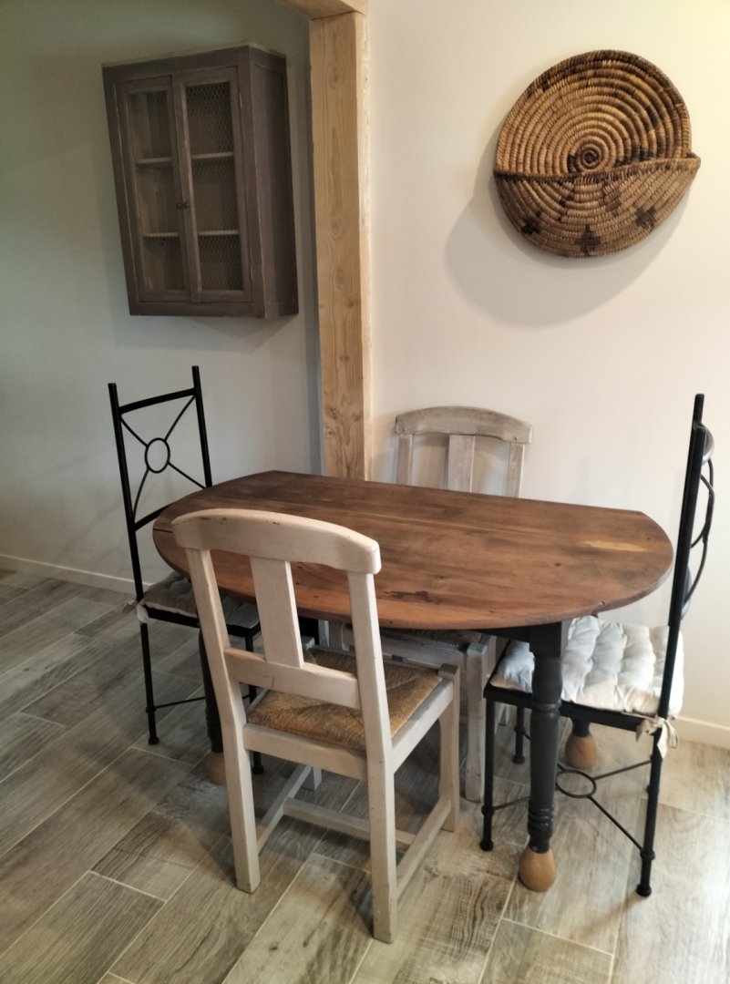 - The equipped kitchen (fridge with freezer, gas hob, coffee machine, kettle, microwave,