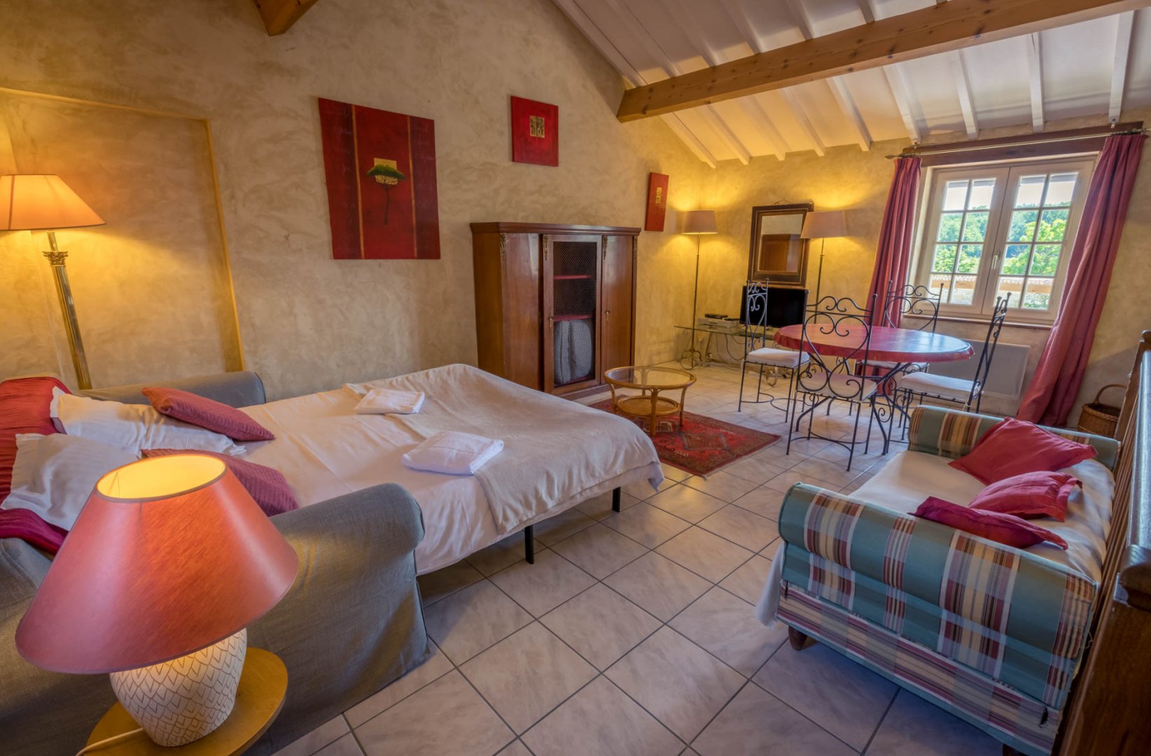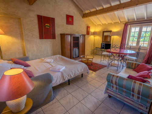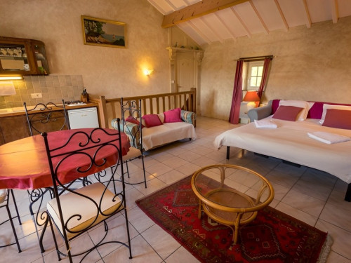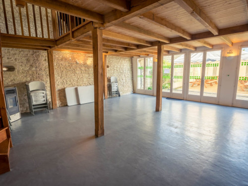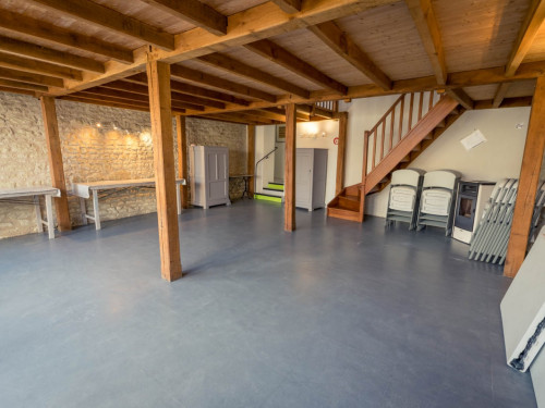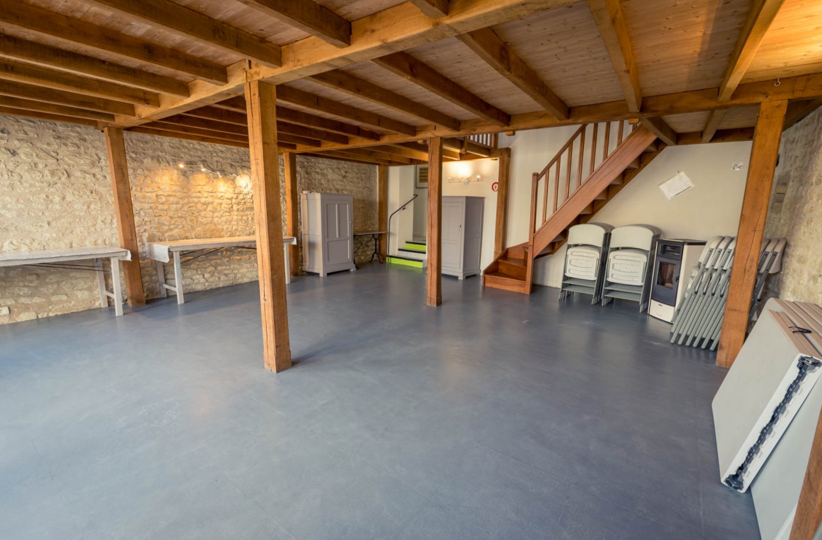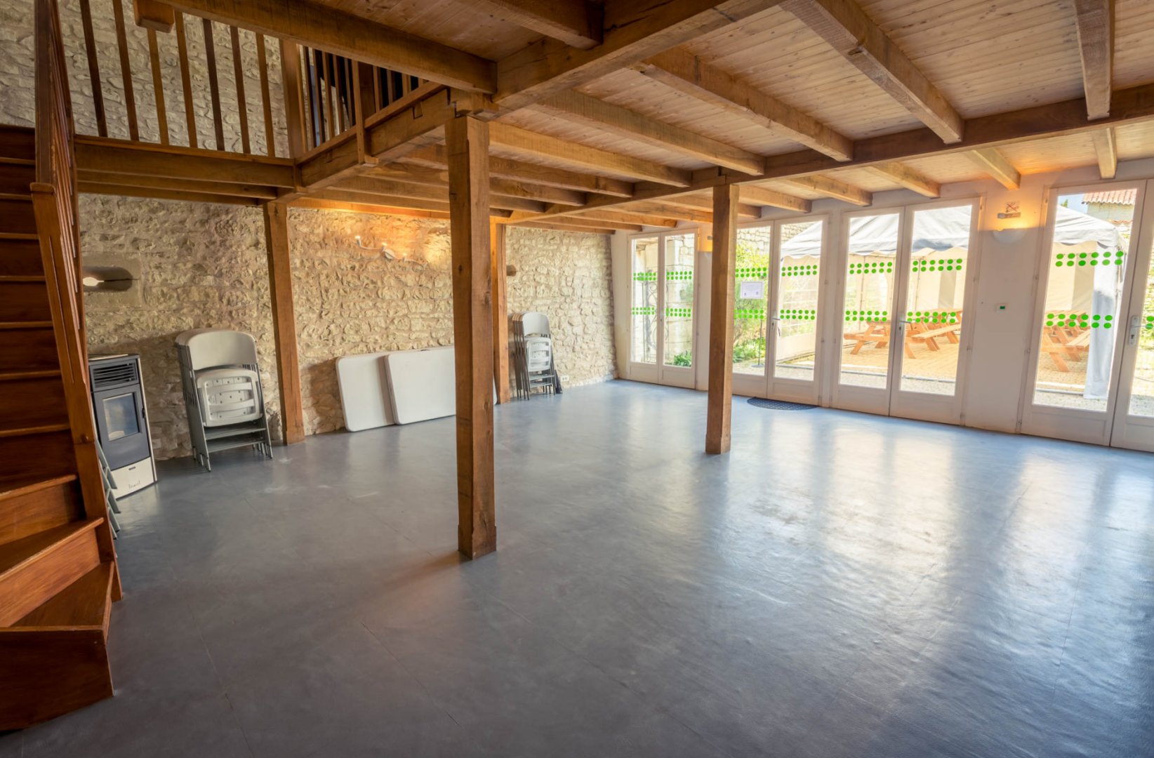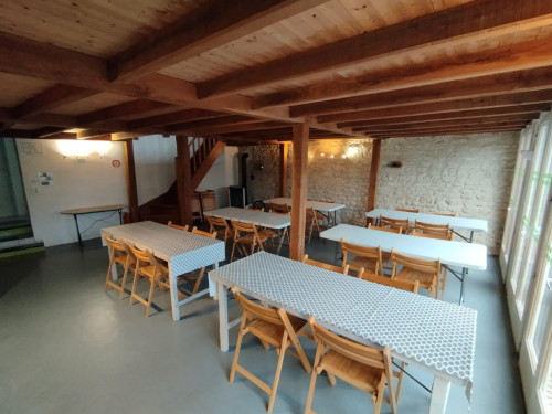 L'espace commun La Sente avec une salle à manger de 50 m² équipée tables, chaises, vaisselle, un salon mezzanine de 50 m² avec TV DVD et babyfoot, une cuisine équipée, WC, vous est également proposé pour la location du domaine complet.