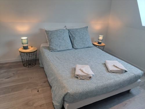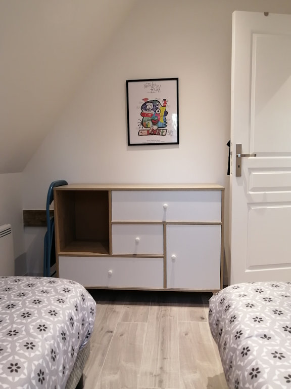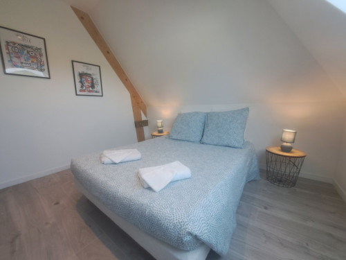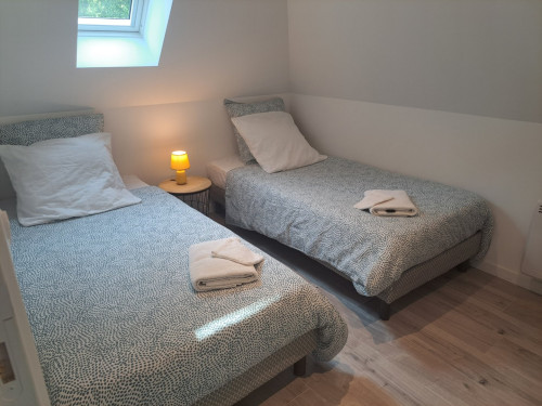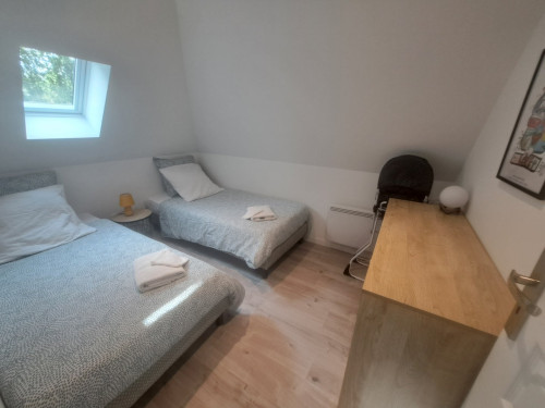 - 2 chambres dont une avec lit double, une avec 2 lit simple (possible de rapprocher les 2 lits 180×190cm)