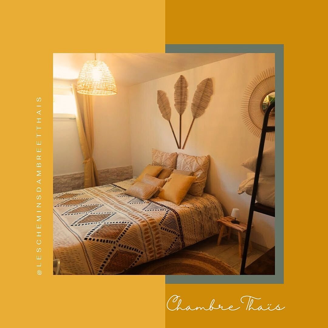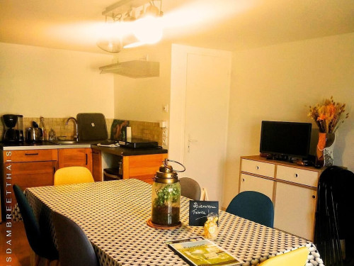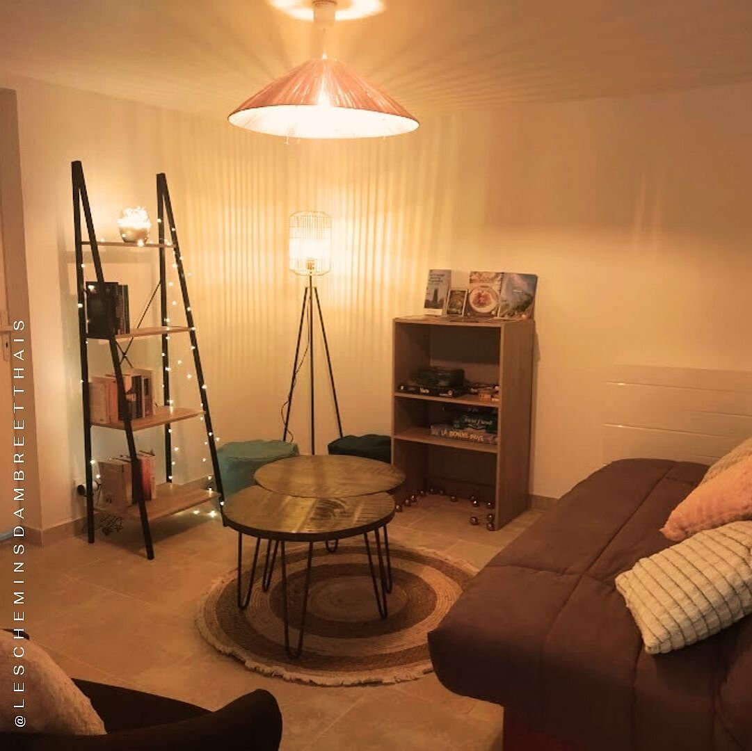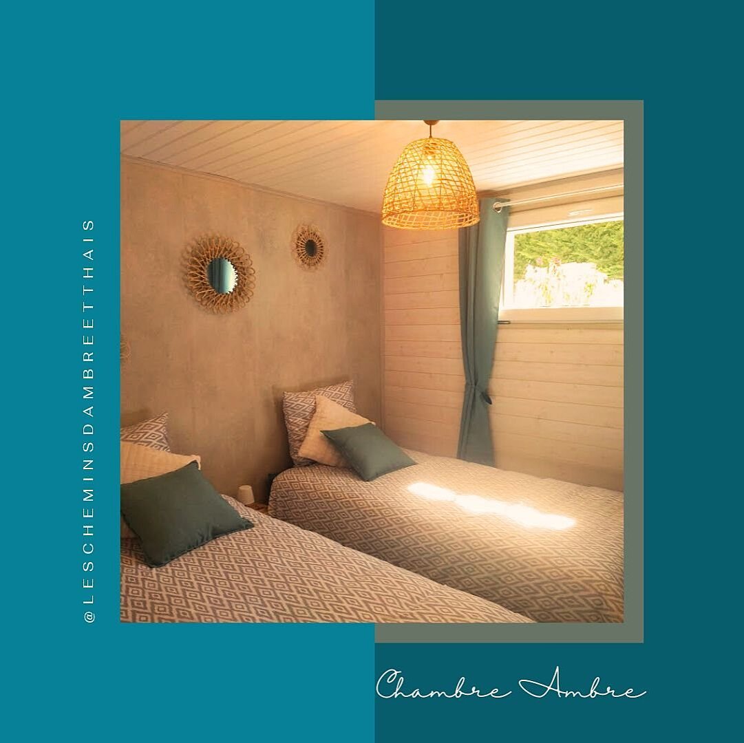 2 chambres : Chambre Thaïs + Chambre Ambre + 1 salle d'eau + 1 wc + salon avec clic-clac + pièce de vie avec cuisine et cheminée