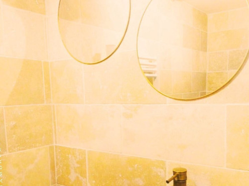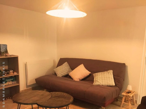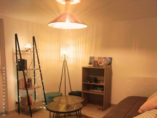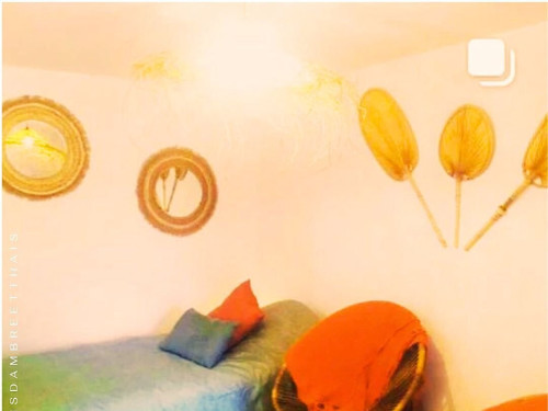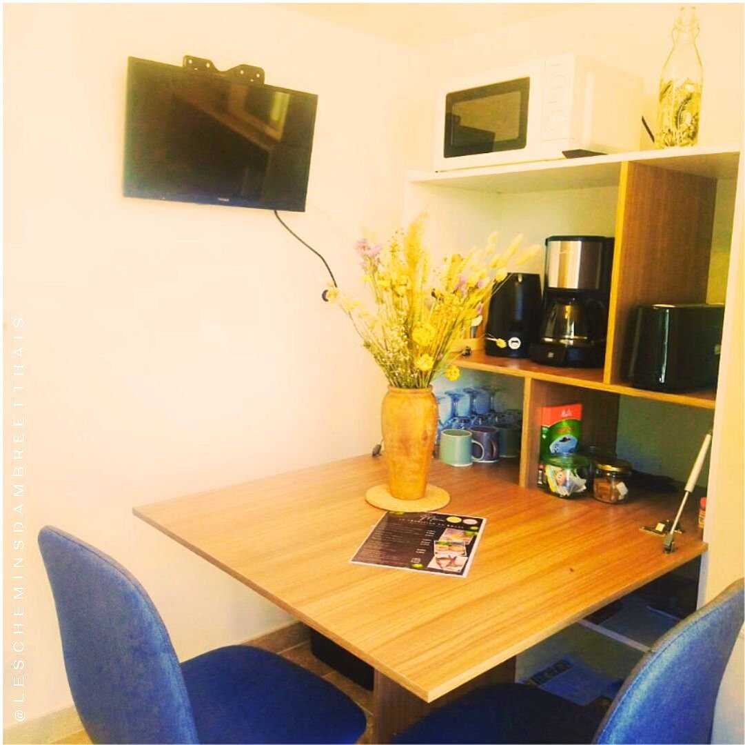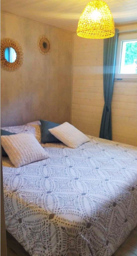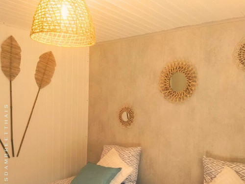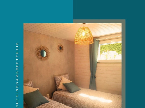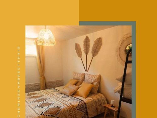 2 chambres : Chambre Thaïs + Chambre Ambre + 1 salle d'eau + 1 wc + salon avec clic-clac + pièce de vie avec cuisine et cheminée