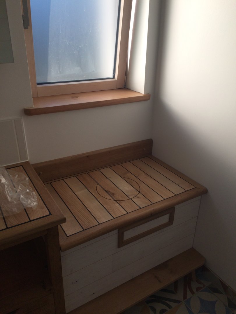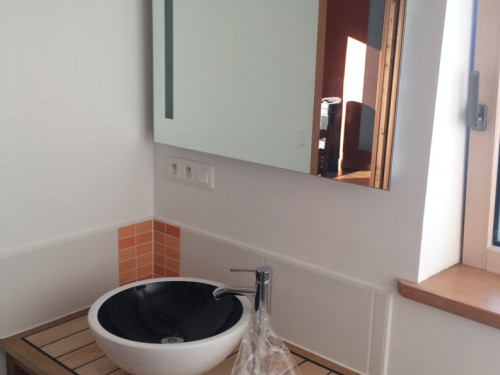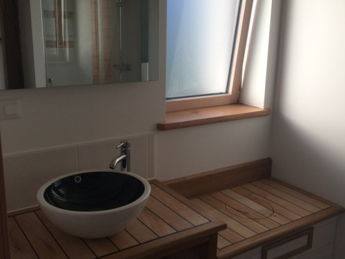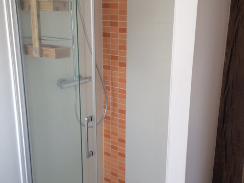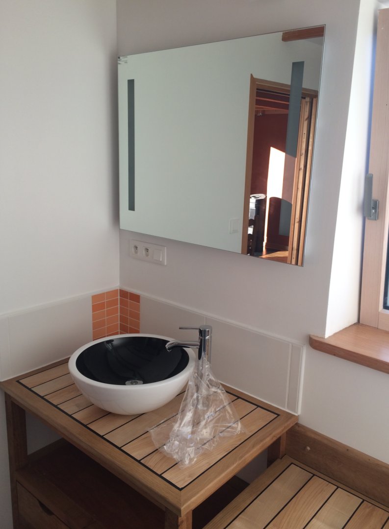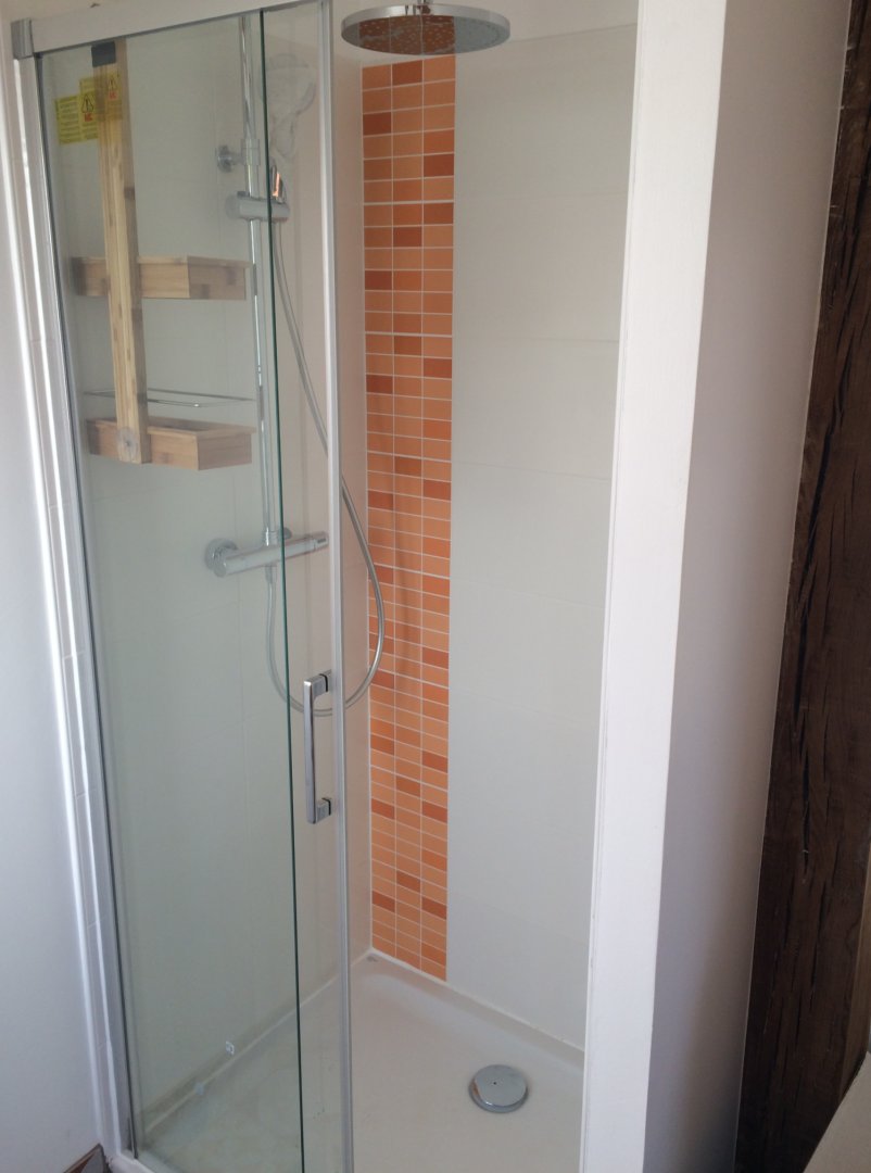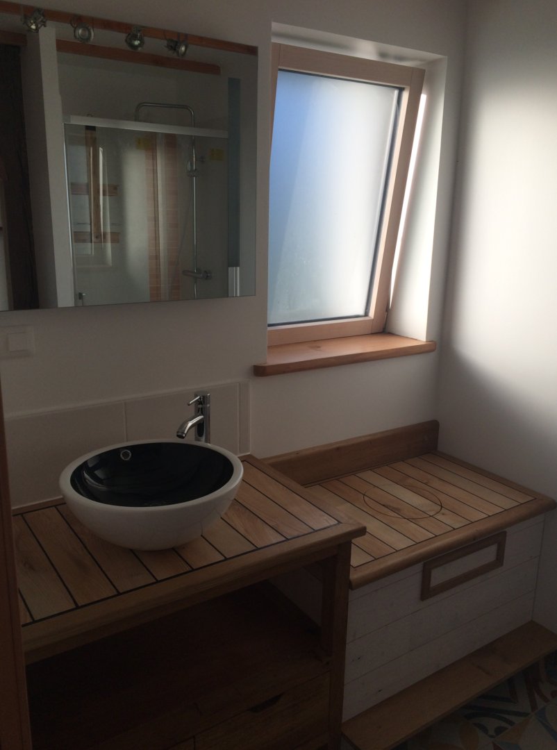 Salle de bain lavabo, douche et toilettes sèches.