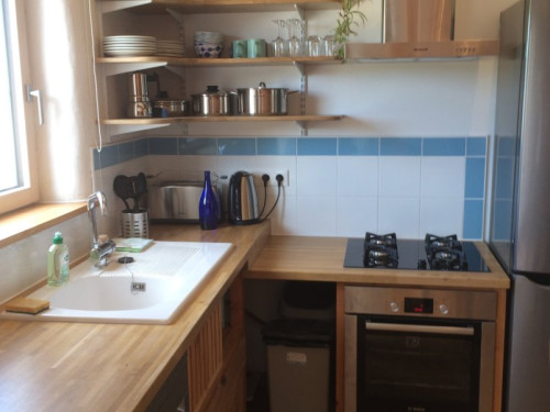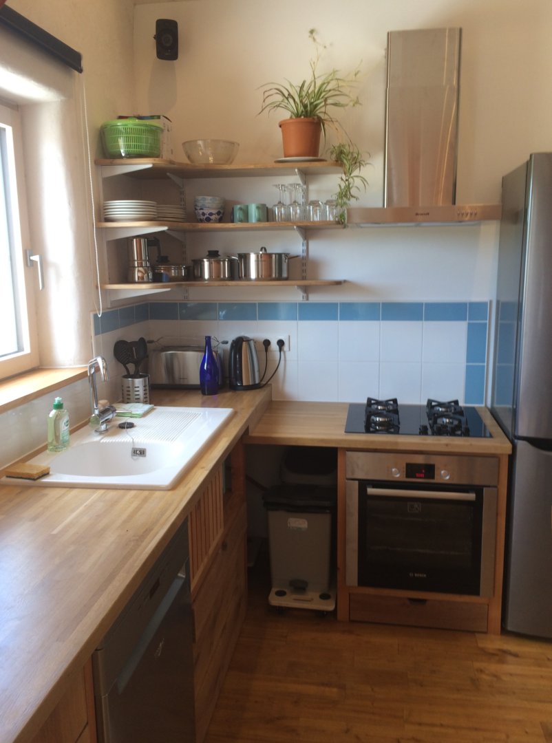 La cuisine comprend un lave-vaisselle, un frigo, une table de cuisson à gaz, une batterie de cuisine, un grille-pain et une bouilloire.
