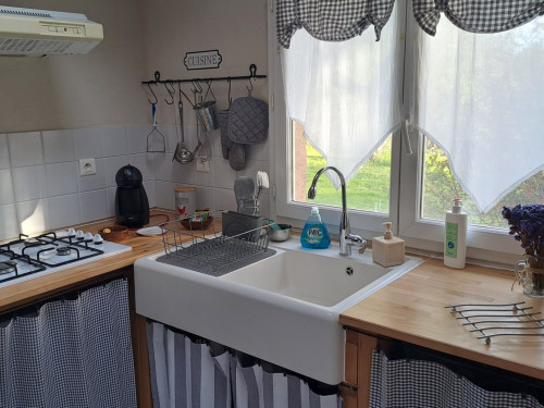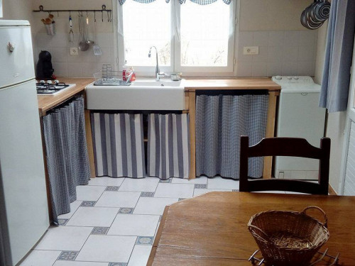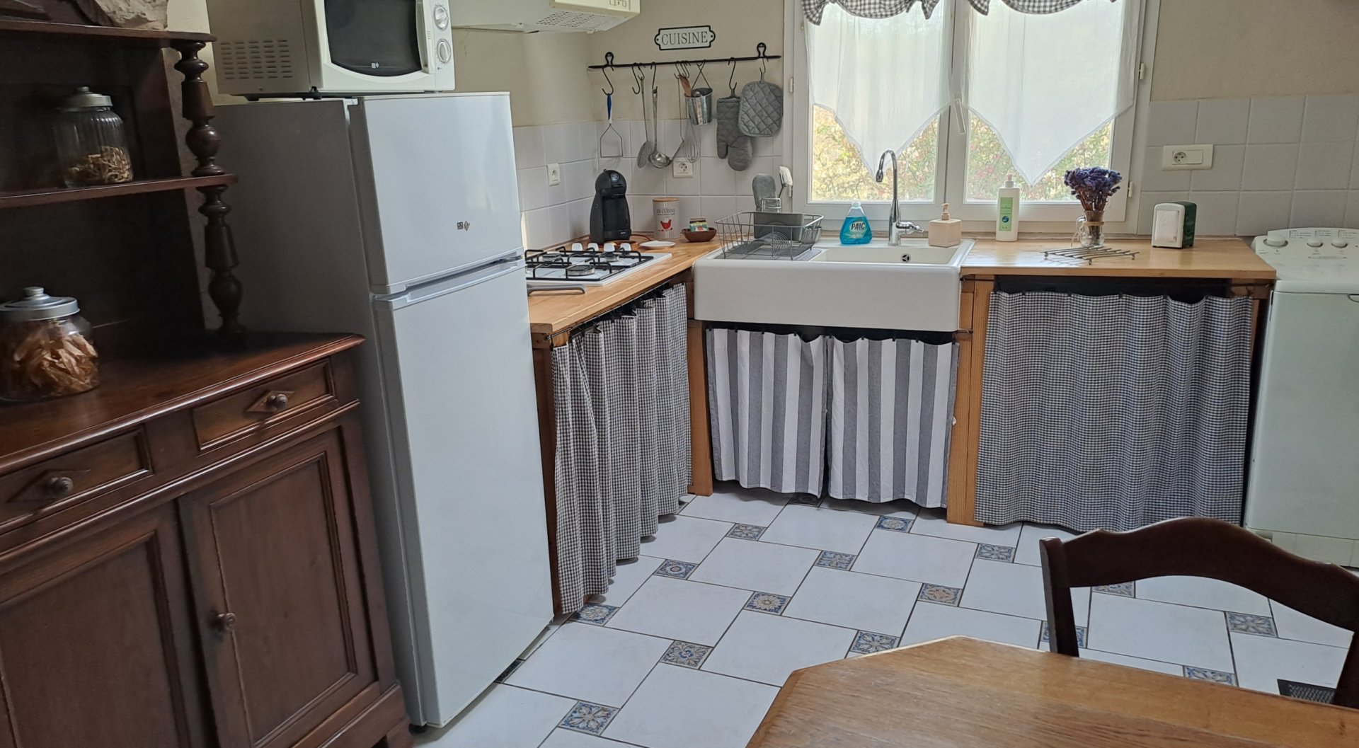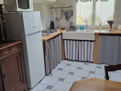 En rez-de-chaussée : cuisine/coin repas, salon.