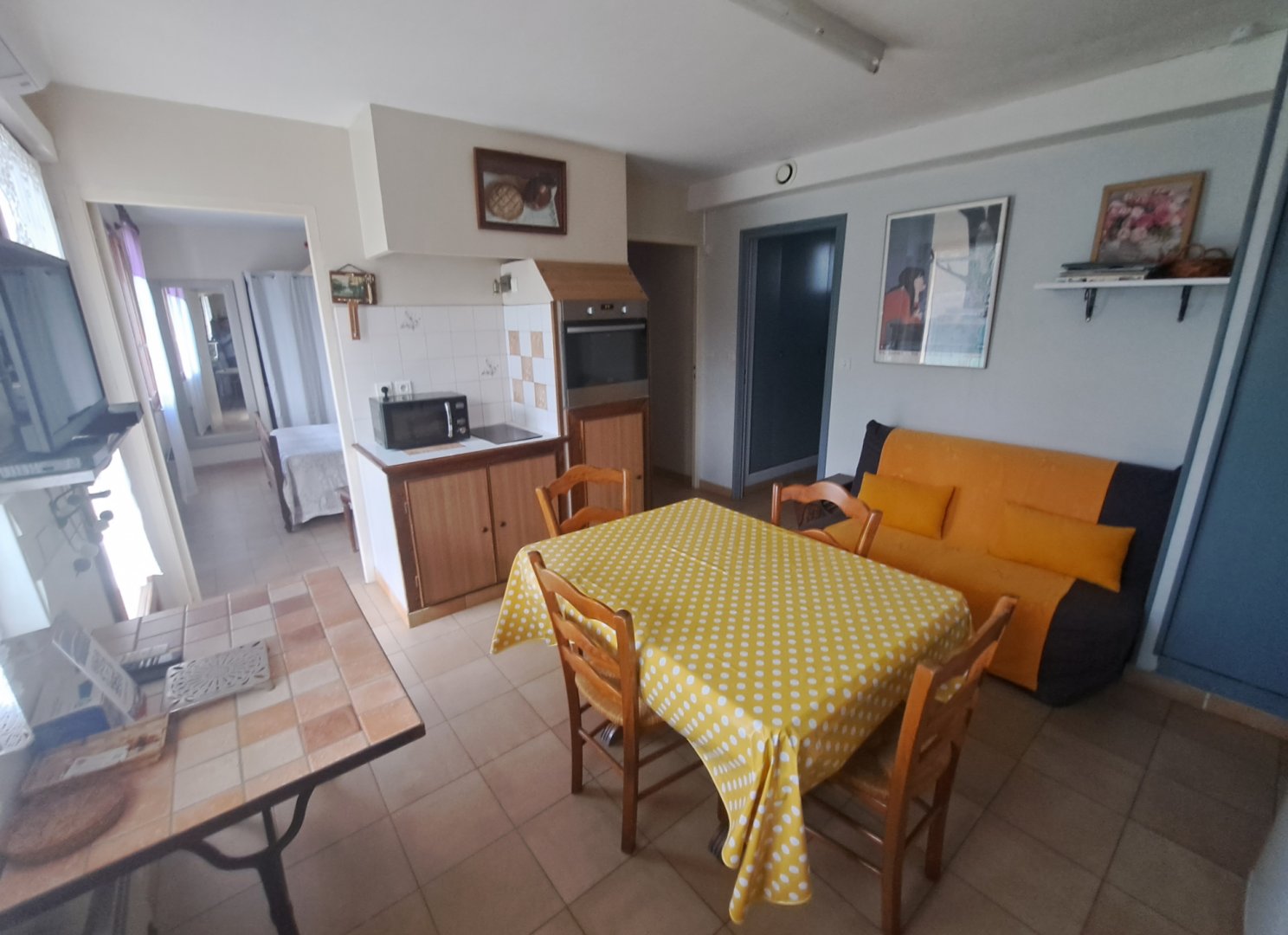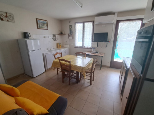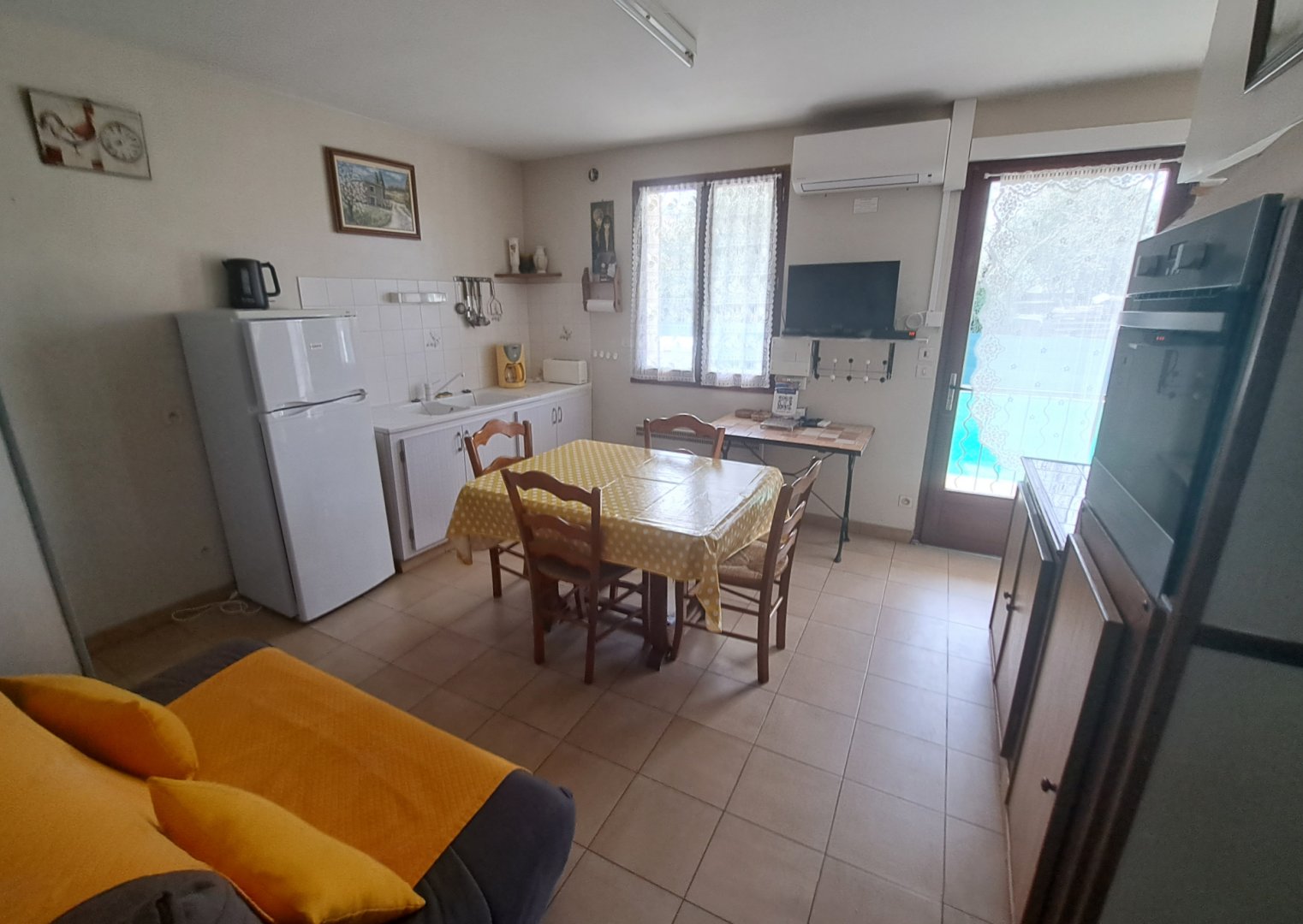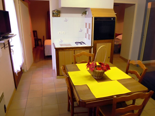 - une cuisine toute équipée (17 m²) avec un four pyrolyse, une plaque vitro céramique (domino), un micro-ondes, un frigo-congélateur, une TV écran plat + décodeur orange + internet fibre, grille pain, cafetière.