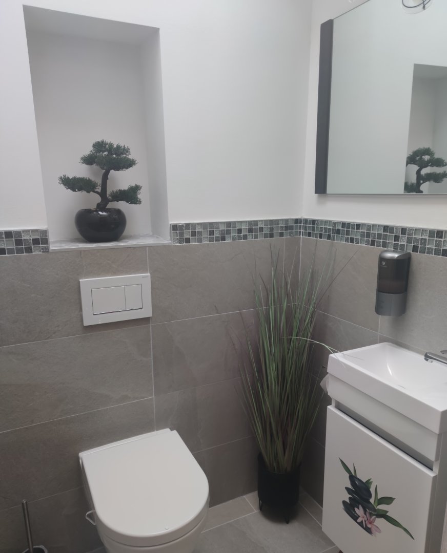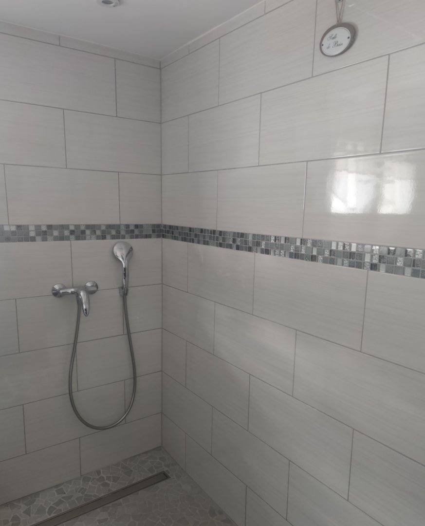 Une chambre parentale avec douche spacieuse à l’italienne, un lavabo, un sèche-cheveux et un lit confortable électrique de 2 x 80 réglable