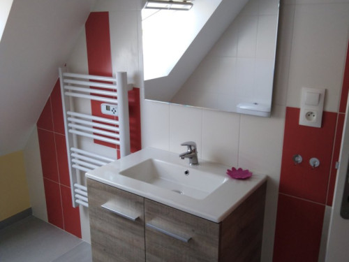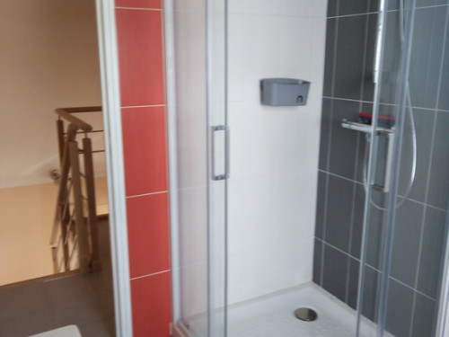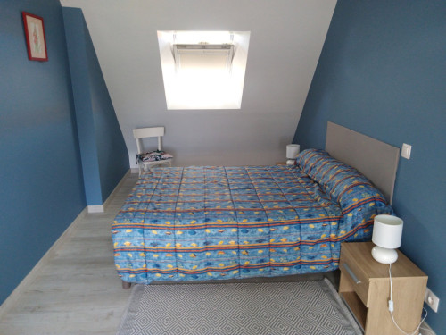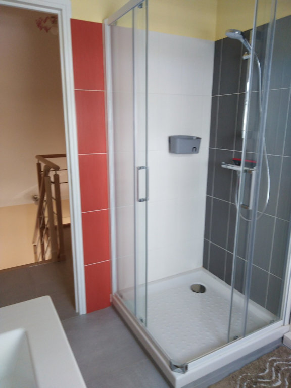 À l'étage, 2 chambres avec 1 lit double chacune, 1 salle de bain avec 1 WC.