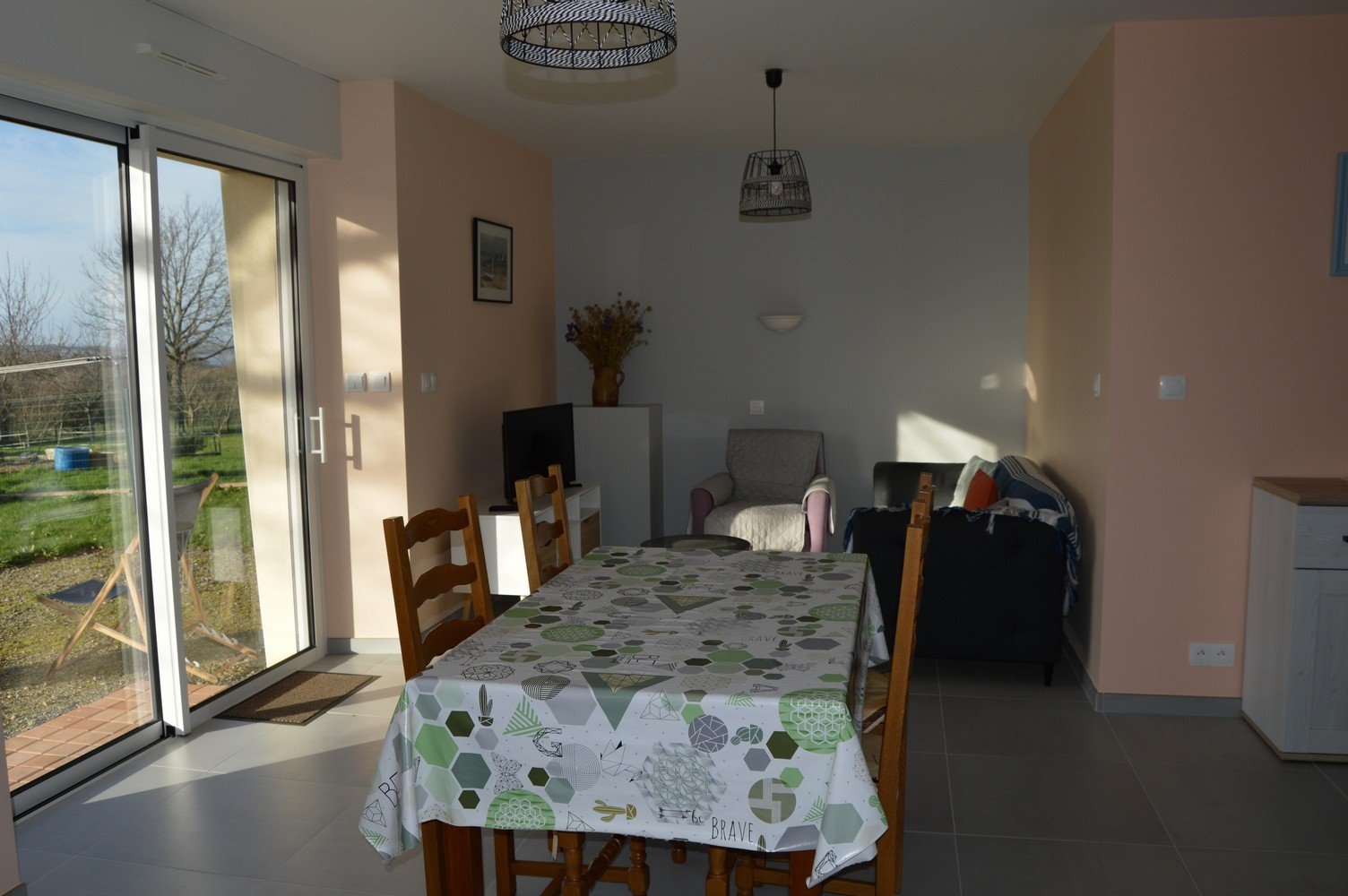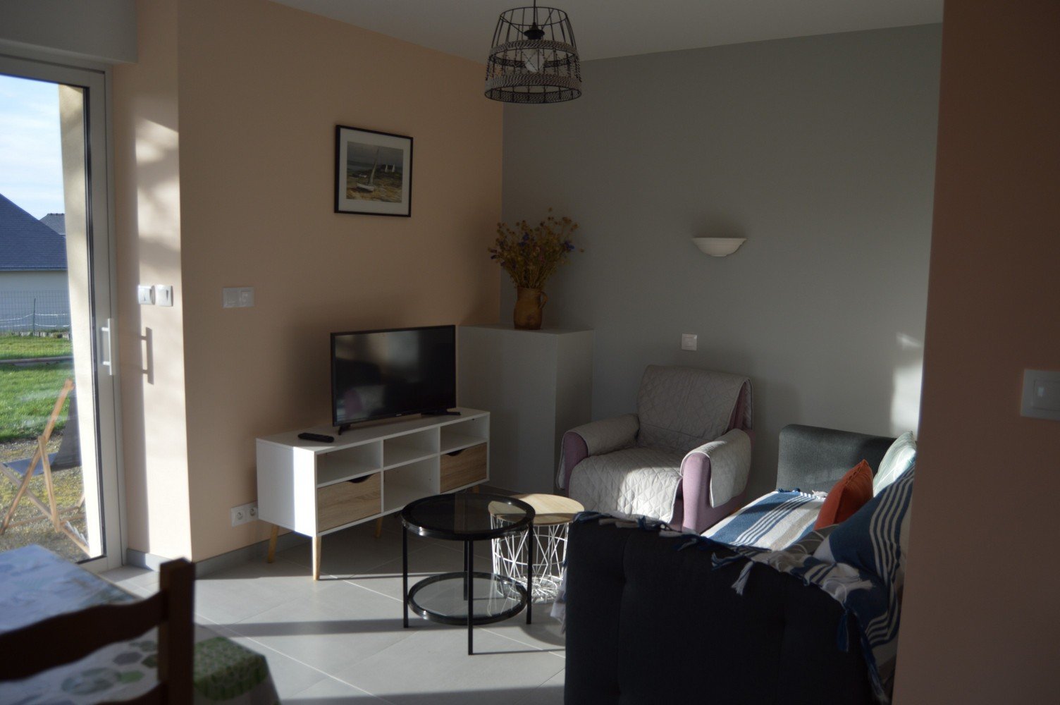À louer dans un village, à 5 min en voiture des plages et des commerces, avec vue sur la mer.