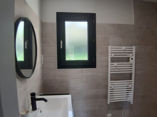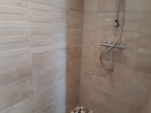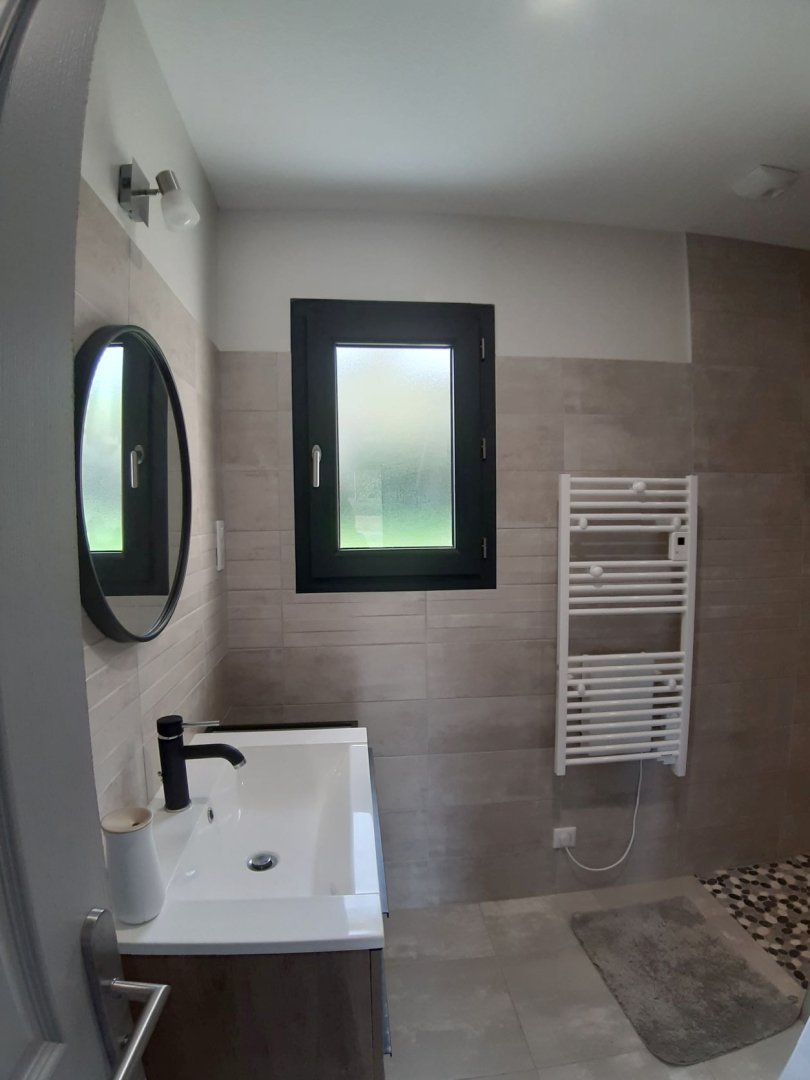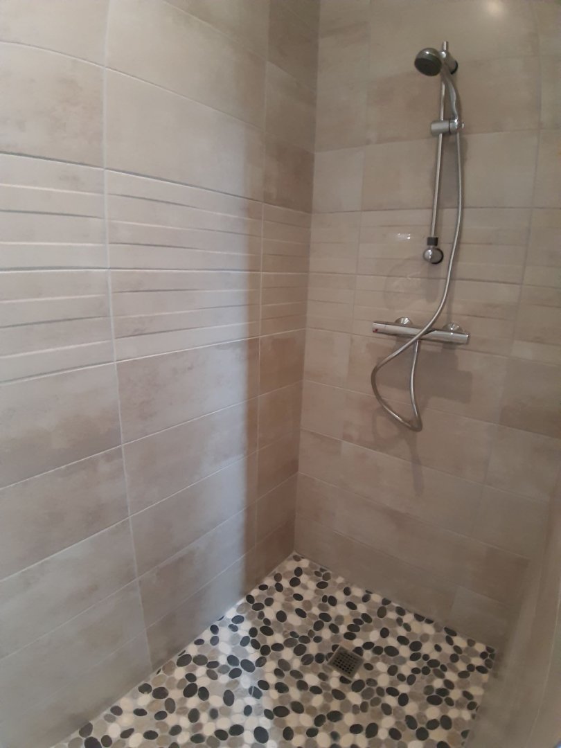 Salle de bain avec grande douche à l'italienne + sèche serviette.