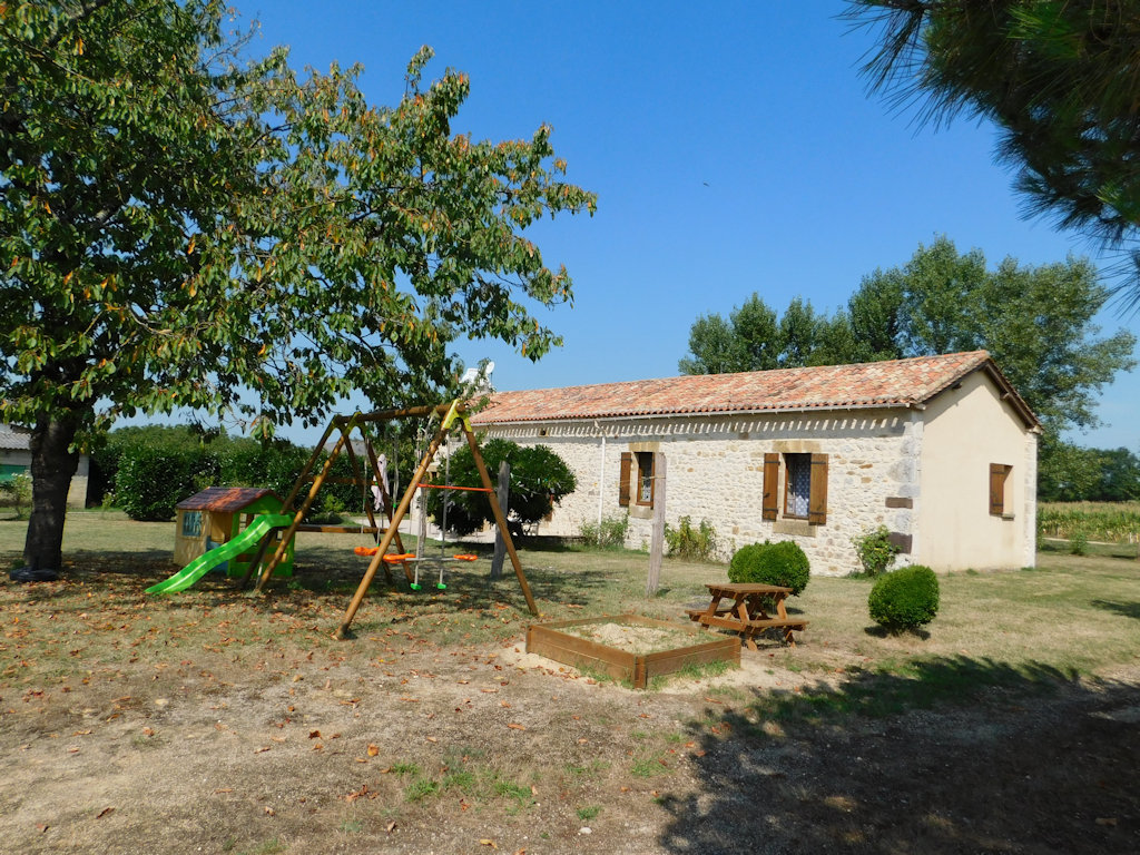- 1 terrasse avec salon de jardin, parasols et barbecue et jeux pour tout-petits