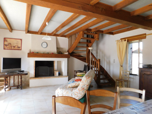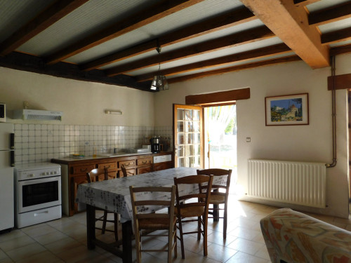 - un grand séjour avec cheminée et coin-cuisine (frigidaire, gazinière avec four, évier eau chaude et froide, micro-ondes, cafetière, lave-vaisselle, lave-linge, canapé, télévision, table et fer à repasser)